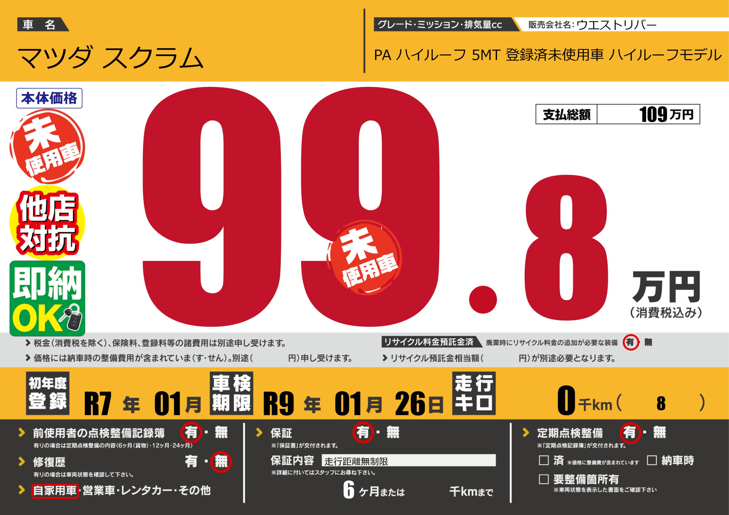 | 車検制限 | R9年 01月 26日 | ||