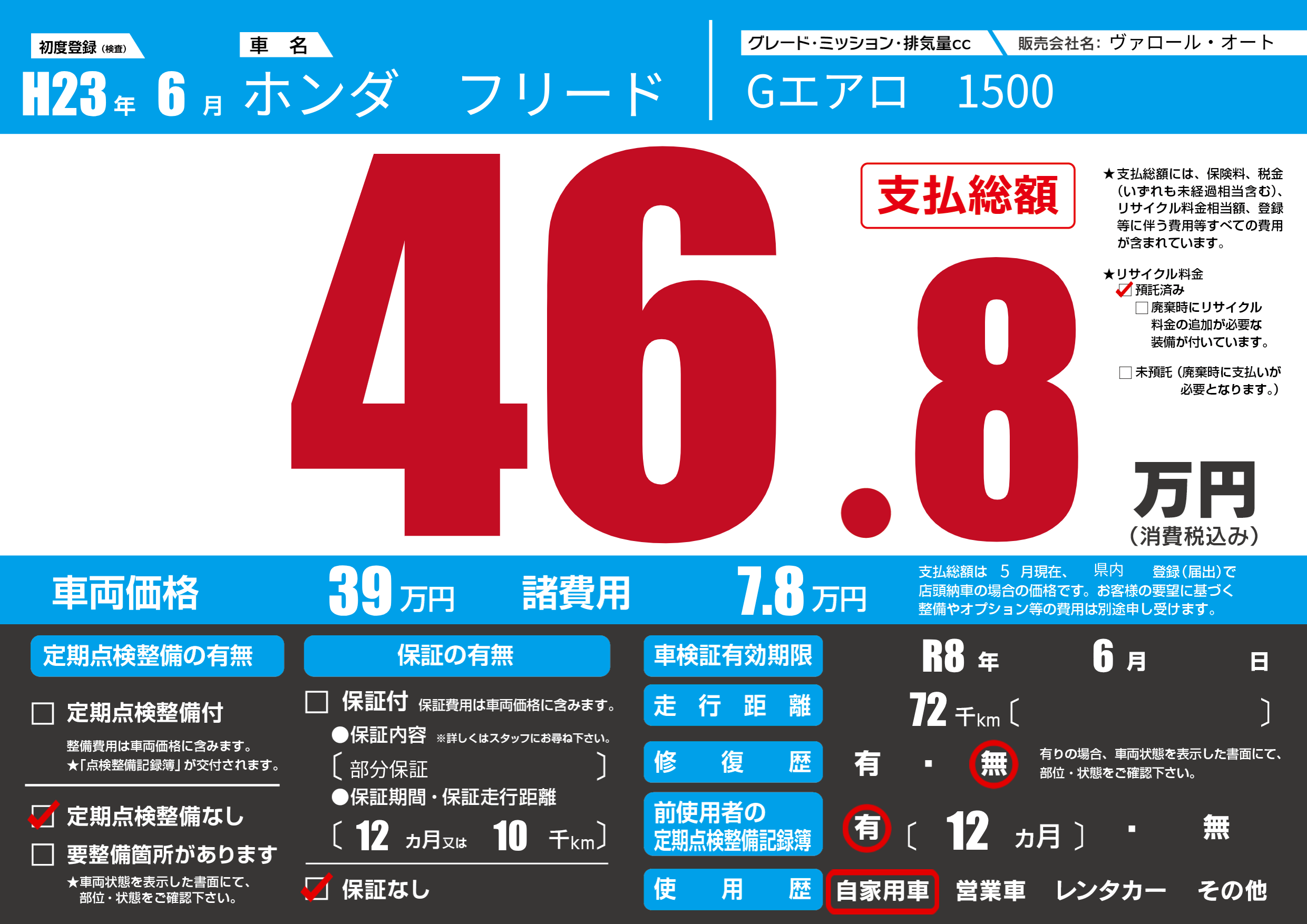 | 車名 | ホンダ フリード | グレード ミッション 排気量 |