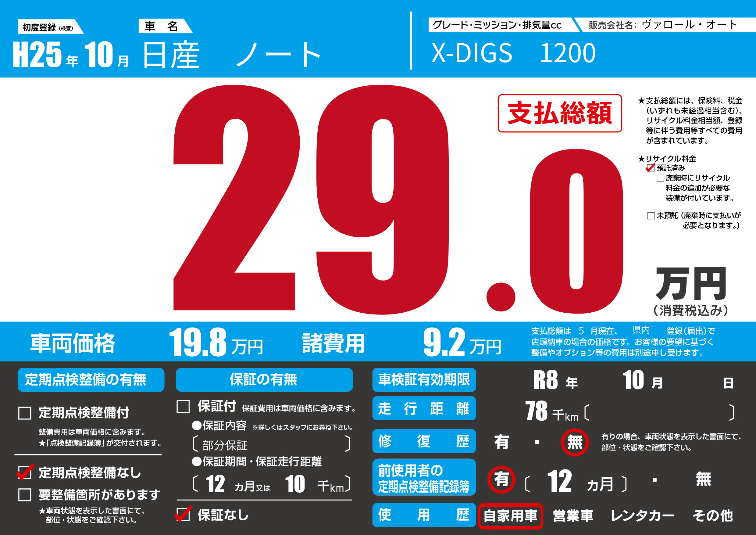| 走行キロ | 7.8万km | 初年度登録 | H25年10月 |