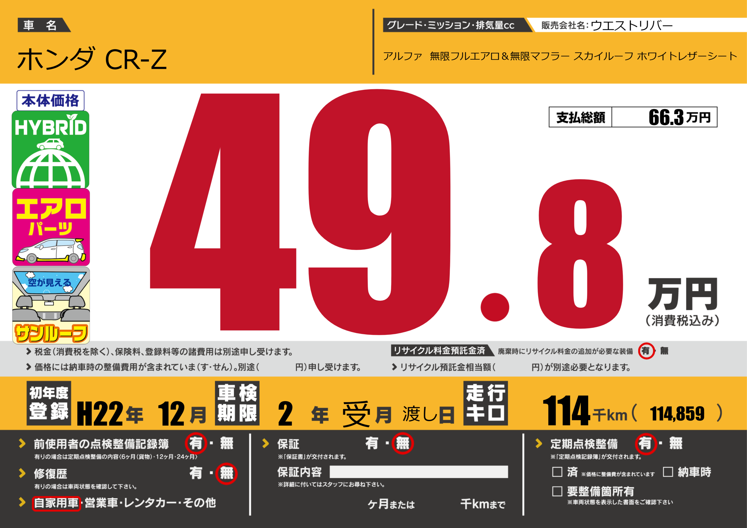 | 車名 | ホンダ CR-Z | グレード ミッション 排気量 |