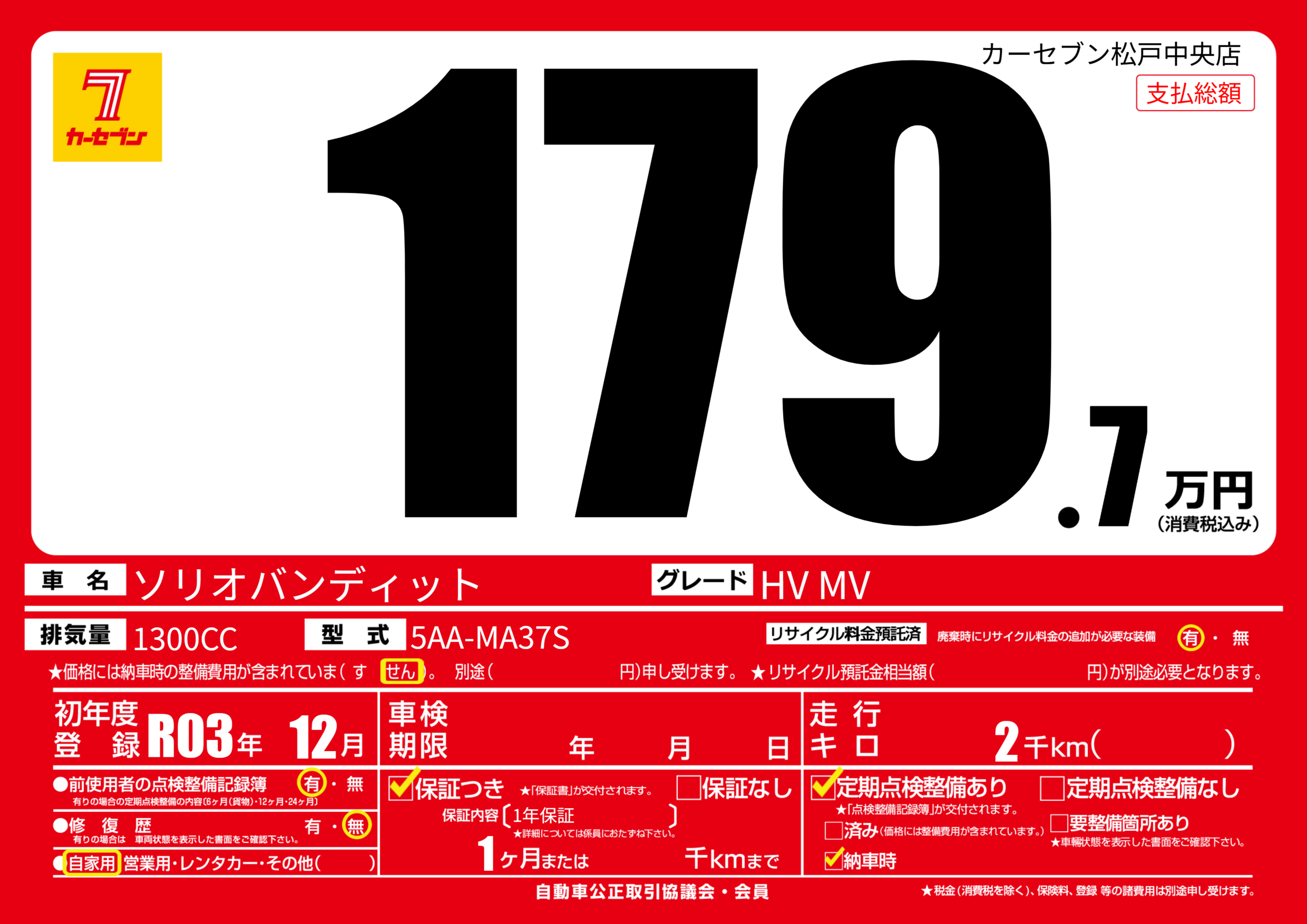 | 定期点検整備 | 定期点検整備あり 納車時あり | ||
