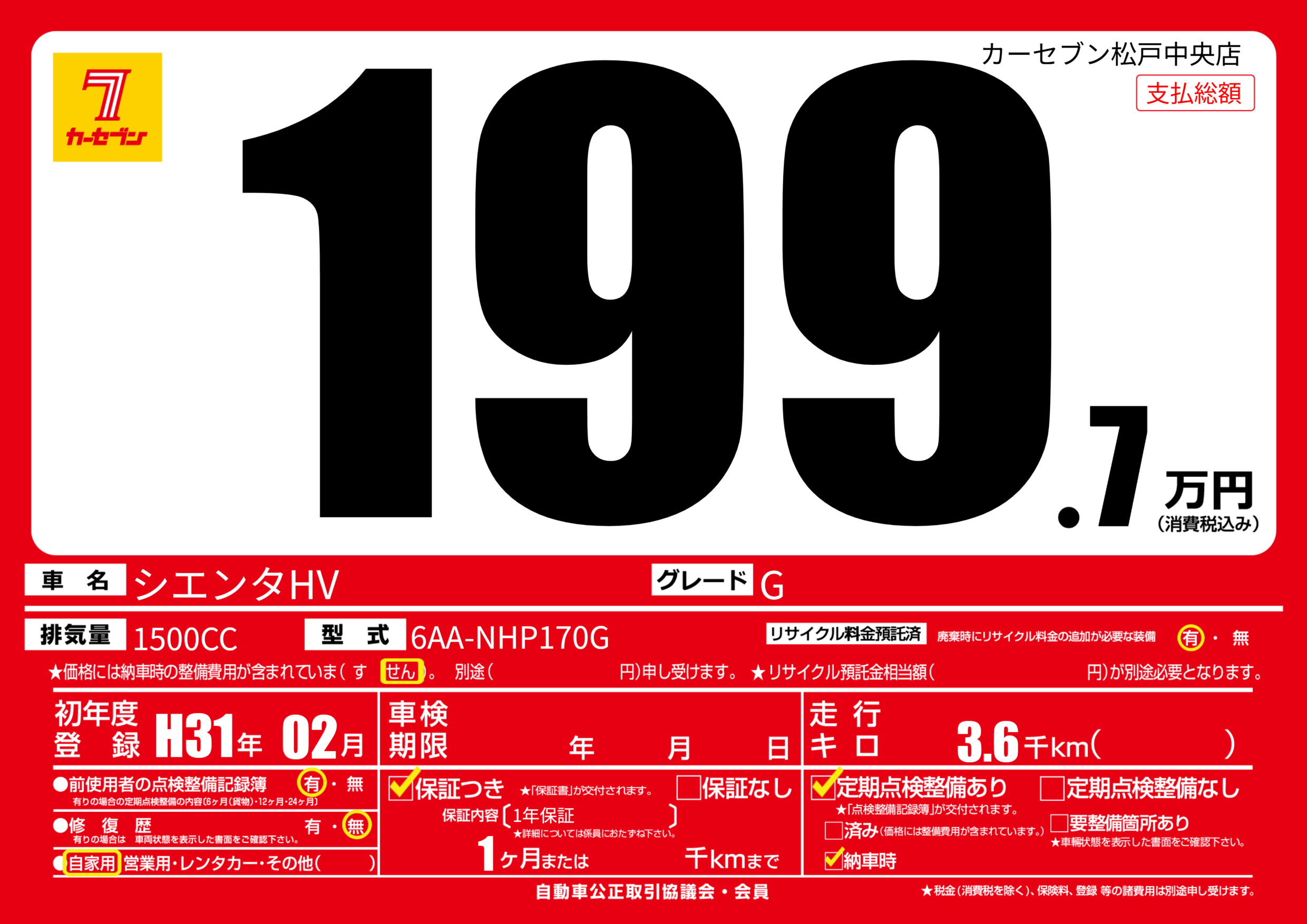 | 車名 | シエンタHV | グレード ミッション 排気量 |