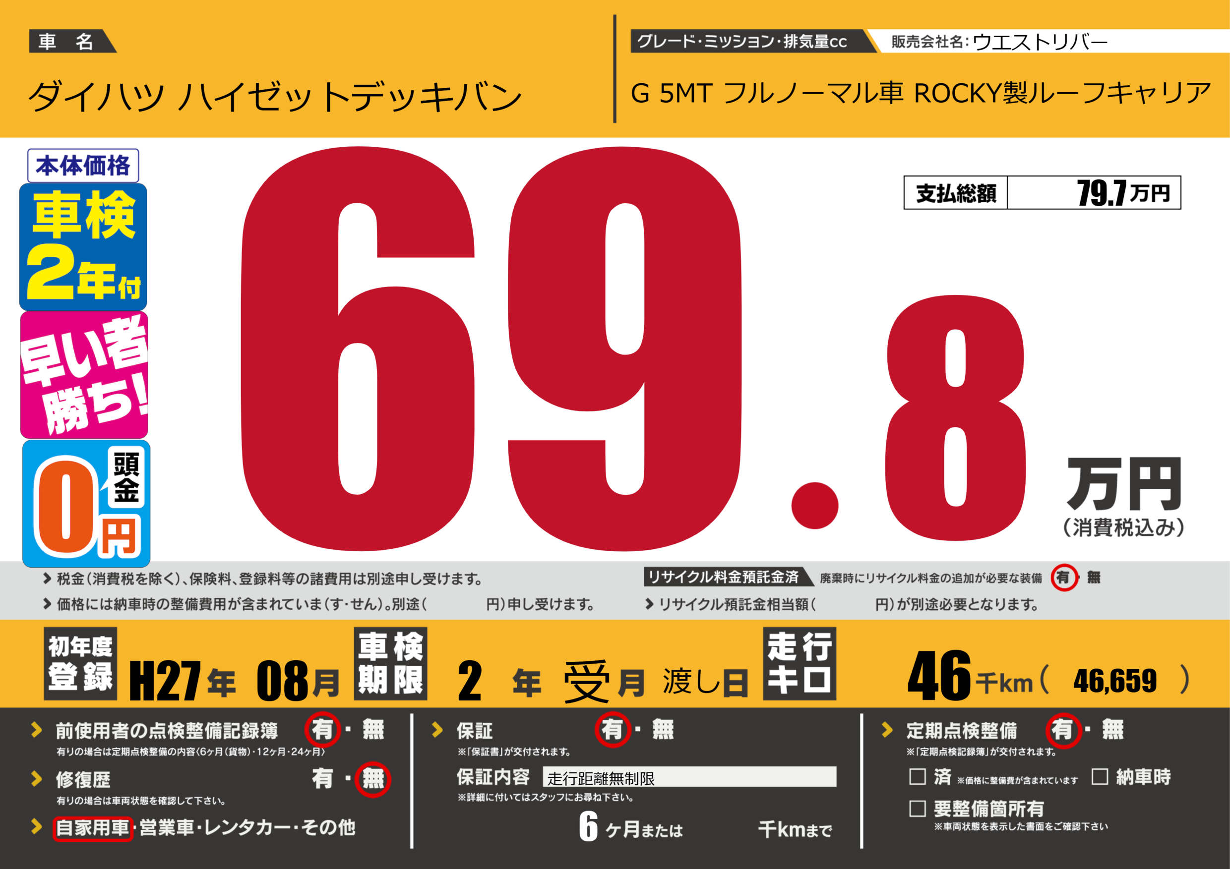 | 走行キロ | 4.6万km | 初年度登録 | H27年08月 |