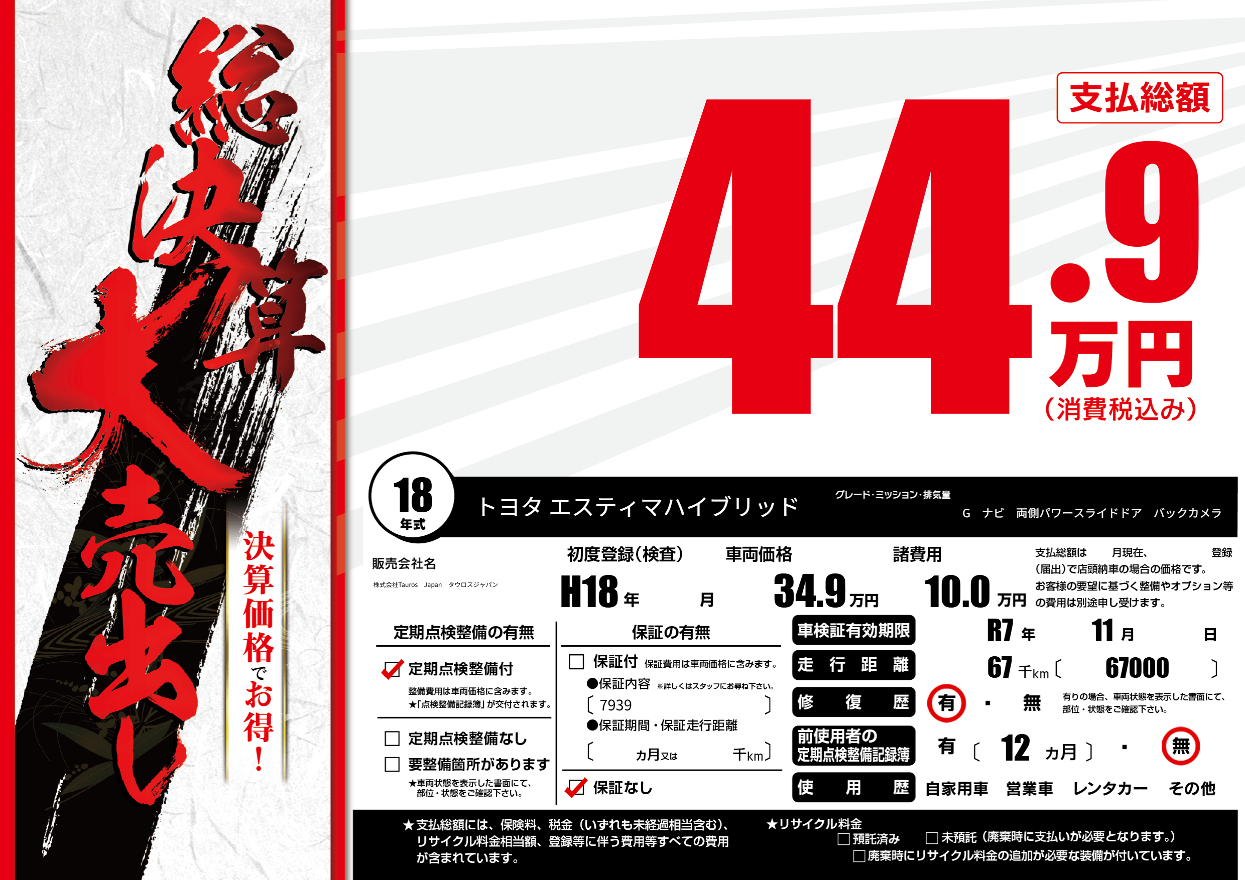 保証なし 保証内容(7939) ---ヶ月または()千kmまで |