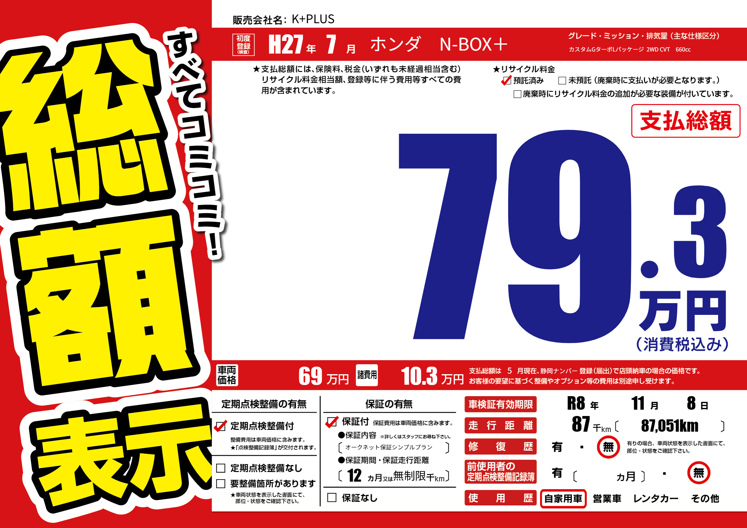 | 車名 | ホンダ N-BOX+ | グレード ミッション 排気量 |