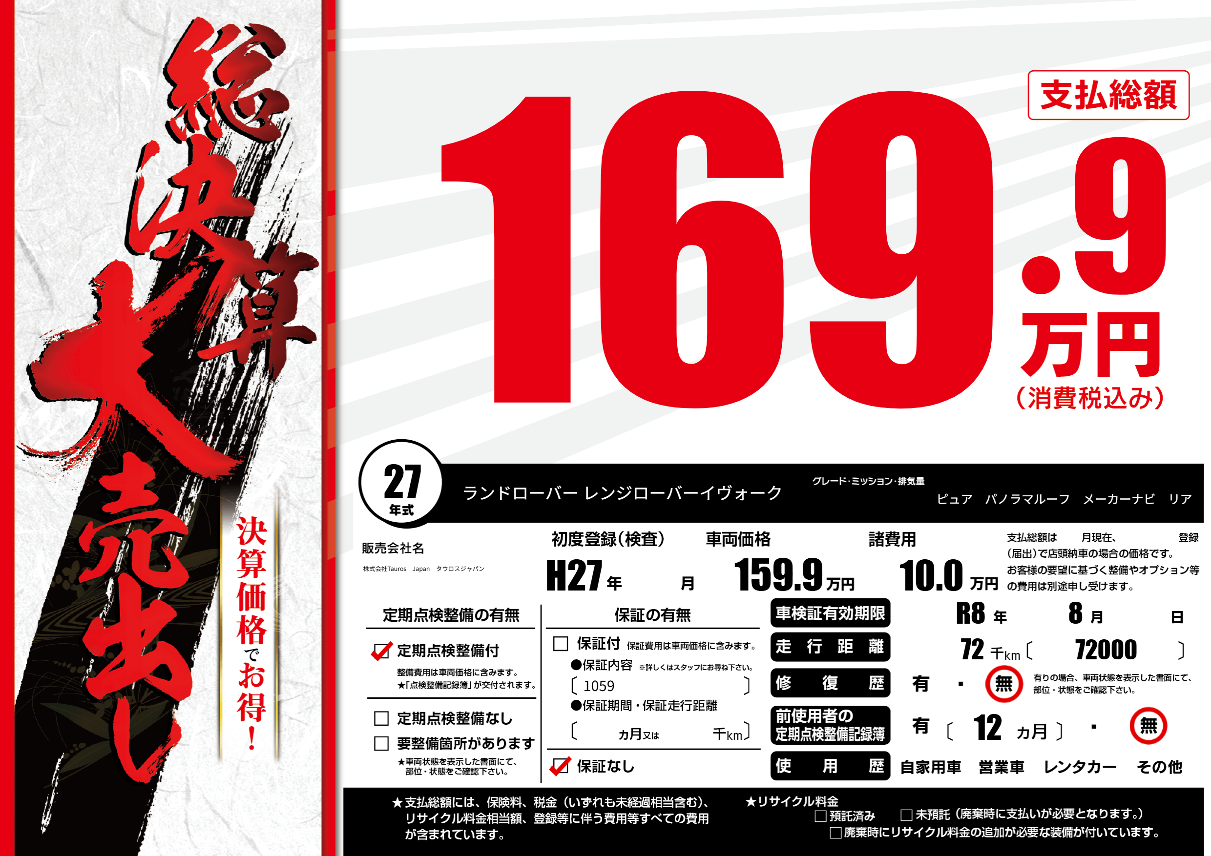 | 車名 | ランドローバー レンジローバーイヴォーク | グレード ミッション 排気量 |