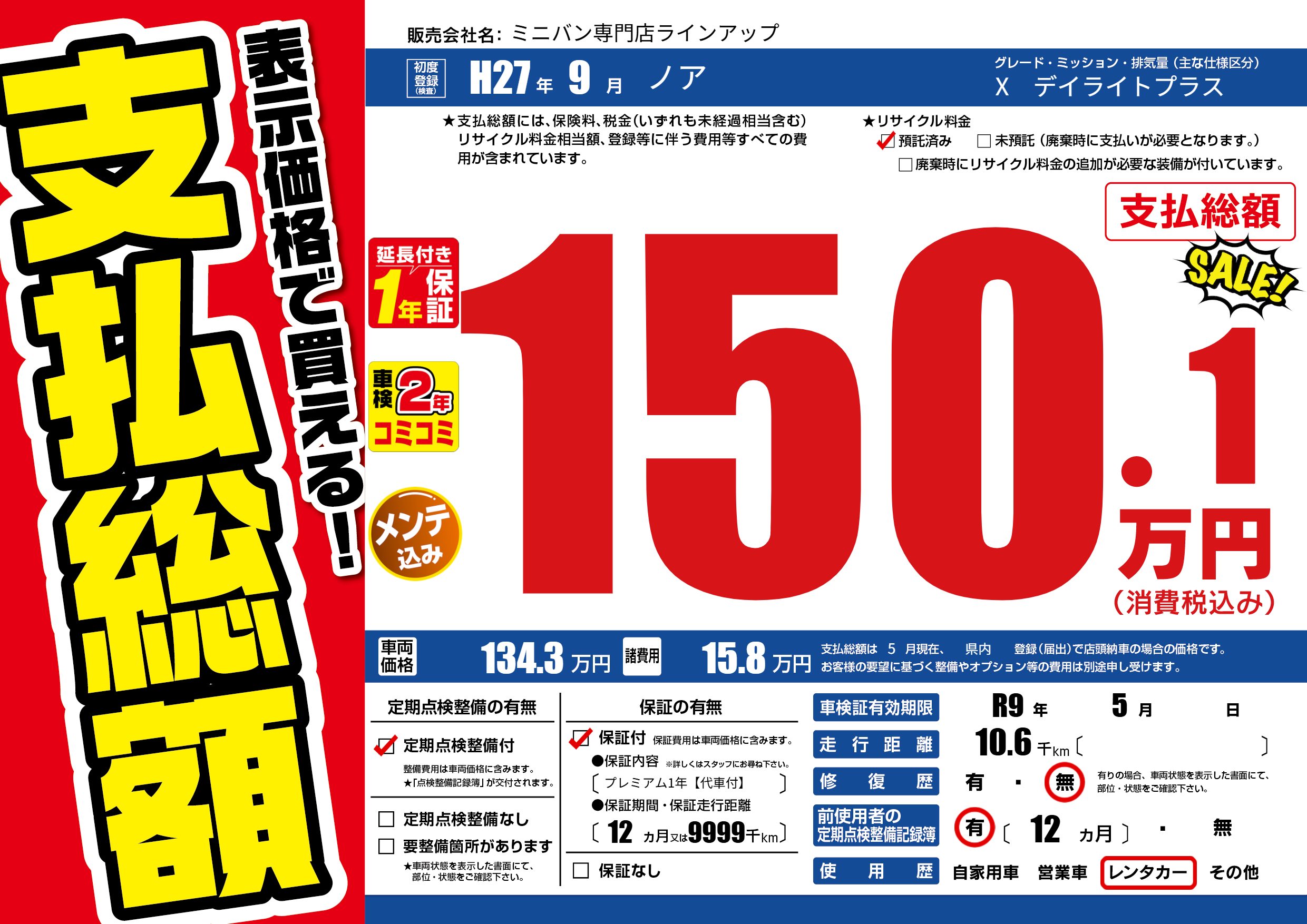 | 走行キロ | 1万km | 初年度登録 | H27年9月 |