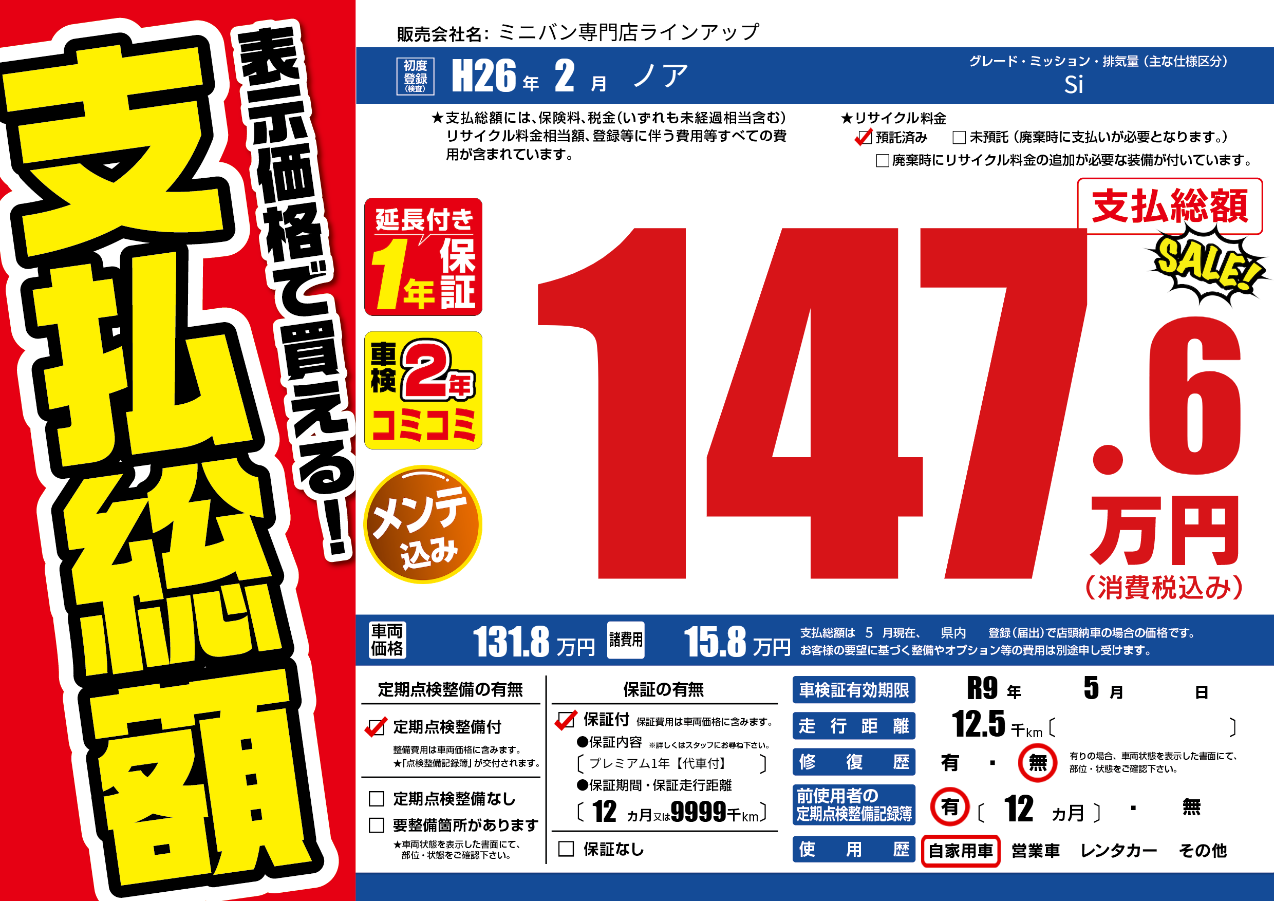 | 走行キロ | 1.2万km | 初年度登録 | H26年2月 |