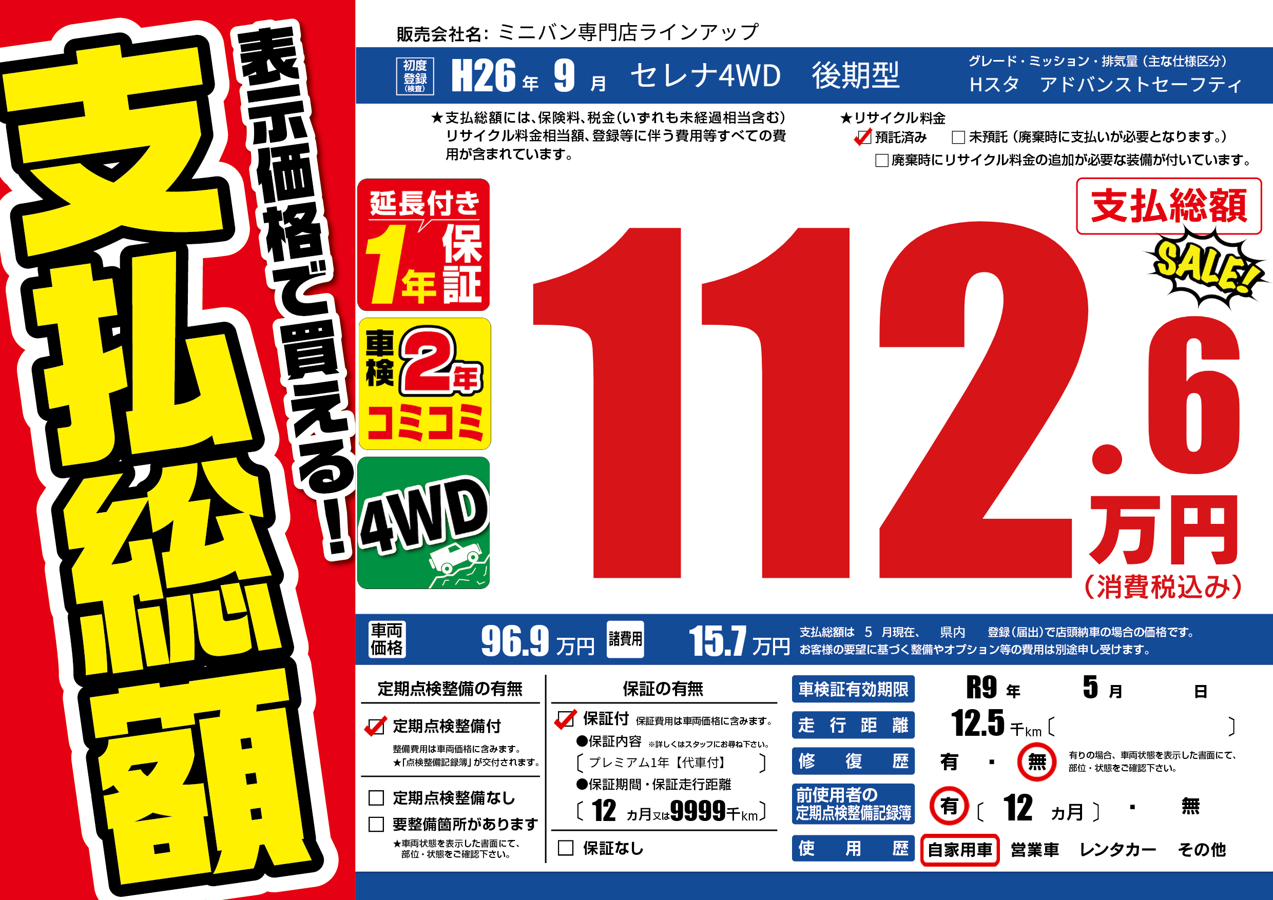 | 車名 | セレナ4WD 後期型 | グレード ミッション 排気量 |