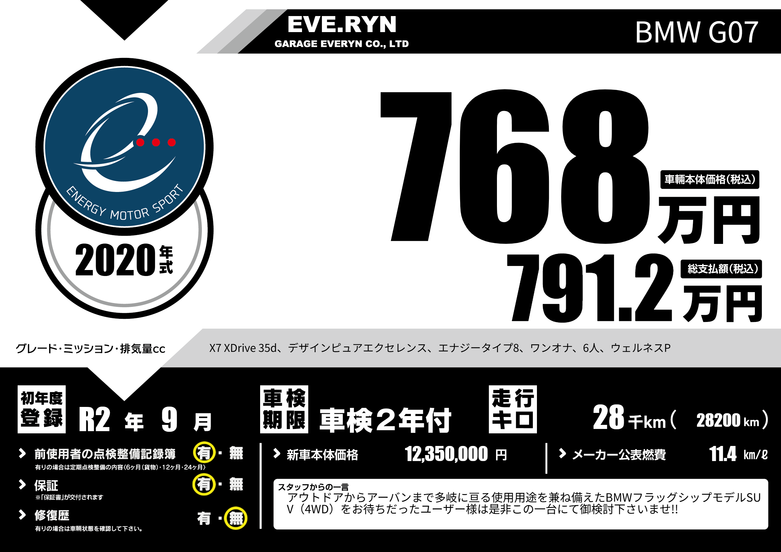 | 車名 | BMW G07 | グレード ミッション 排気量 |