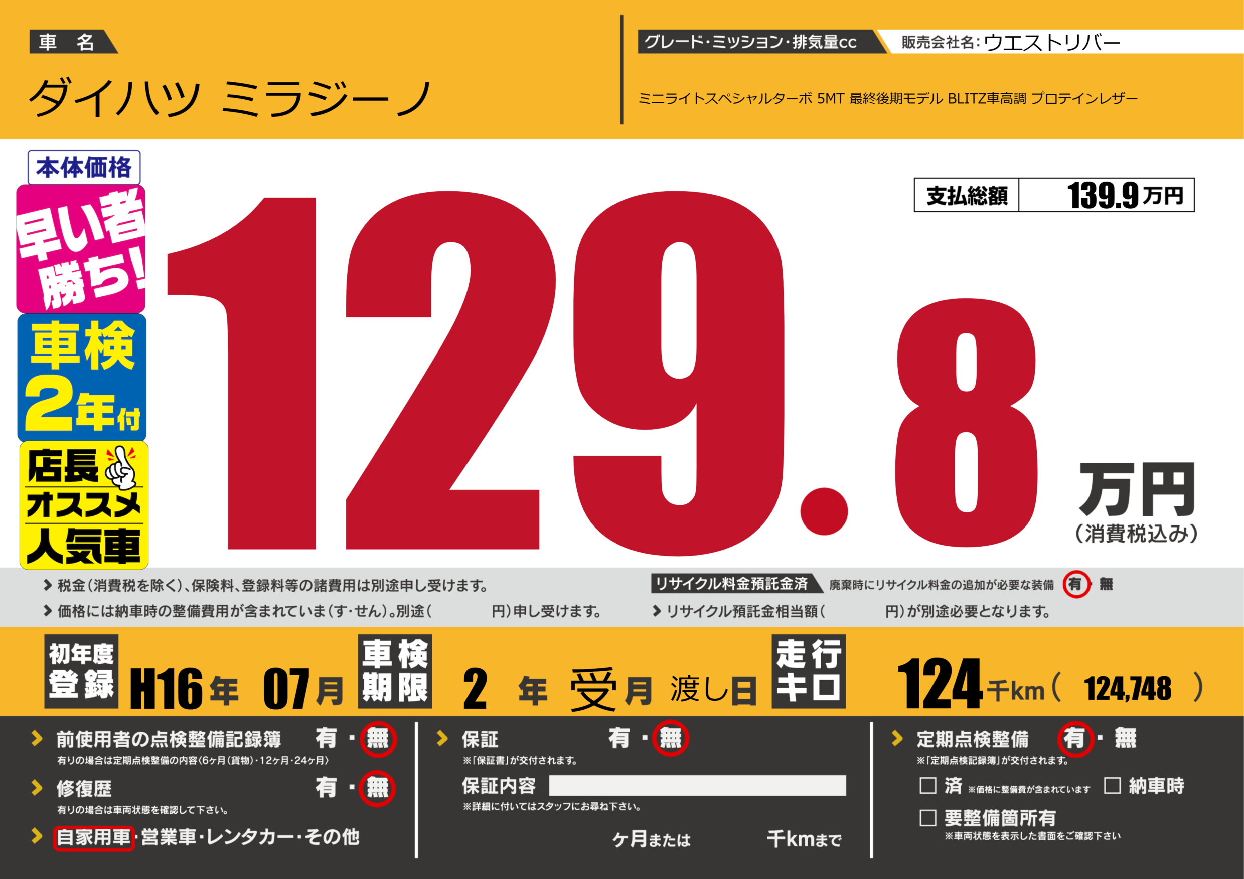 | 走行キロ | 12.4万km | 初年度登録 | H16年07月 |