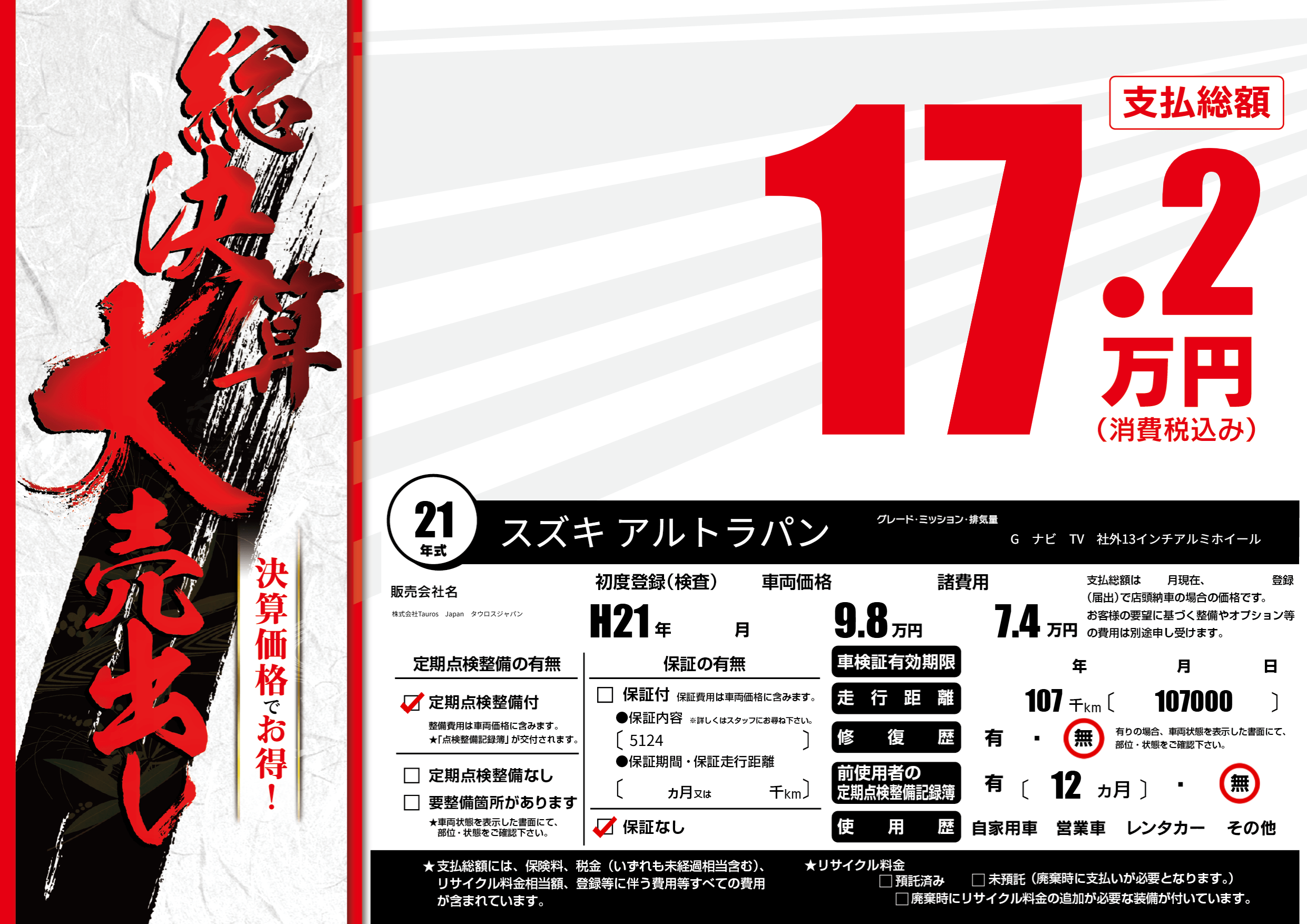 | 走行キロ | 10.7万km | 初年度登録 | H21年---月 |
