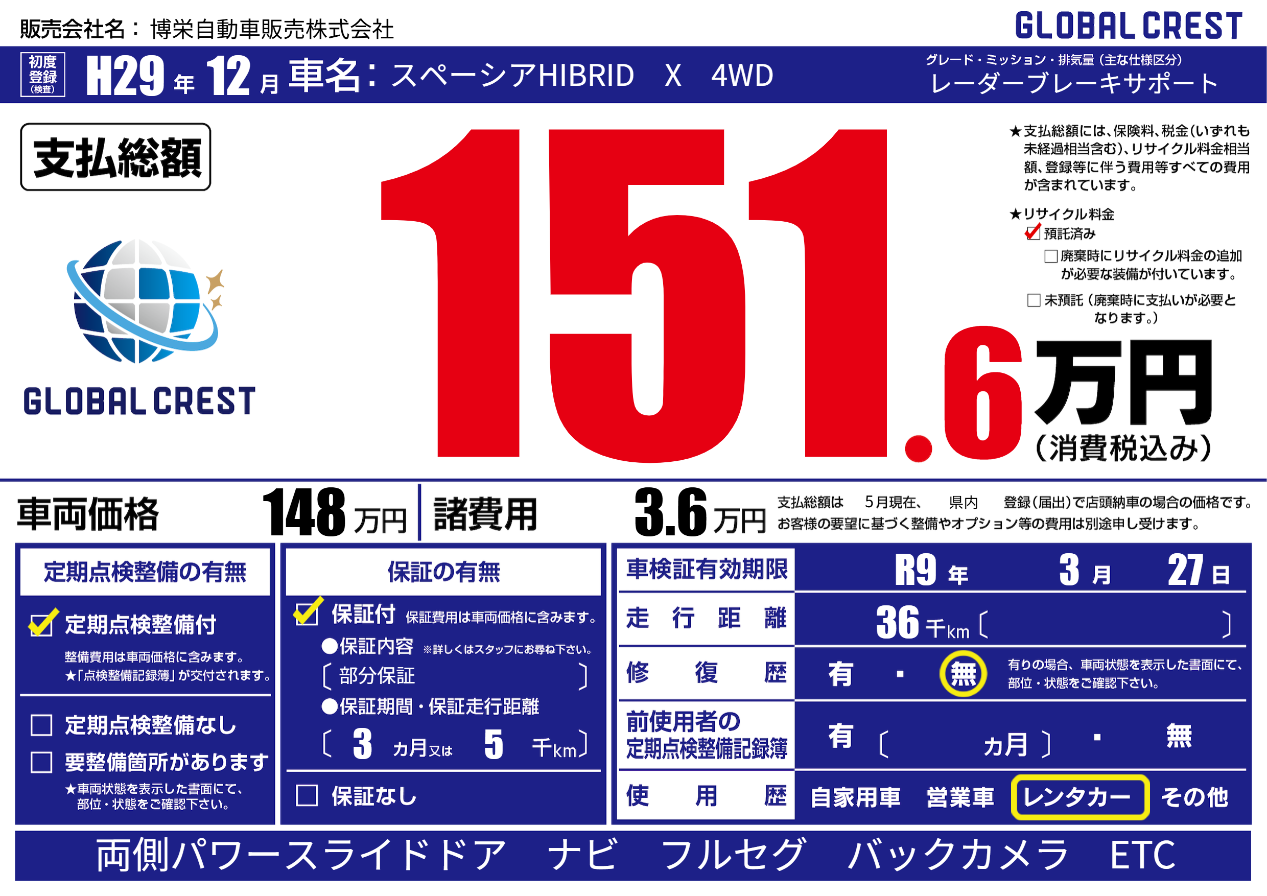| 車名 | スペーシアHIBRID X 4WD | グレード ミッション 排気量 |