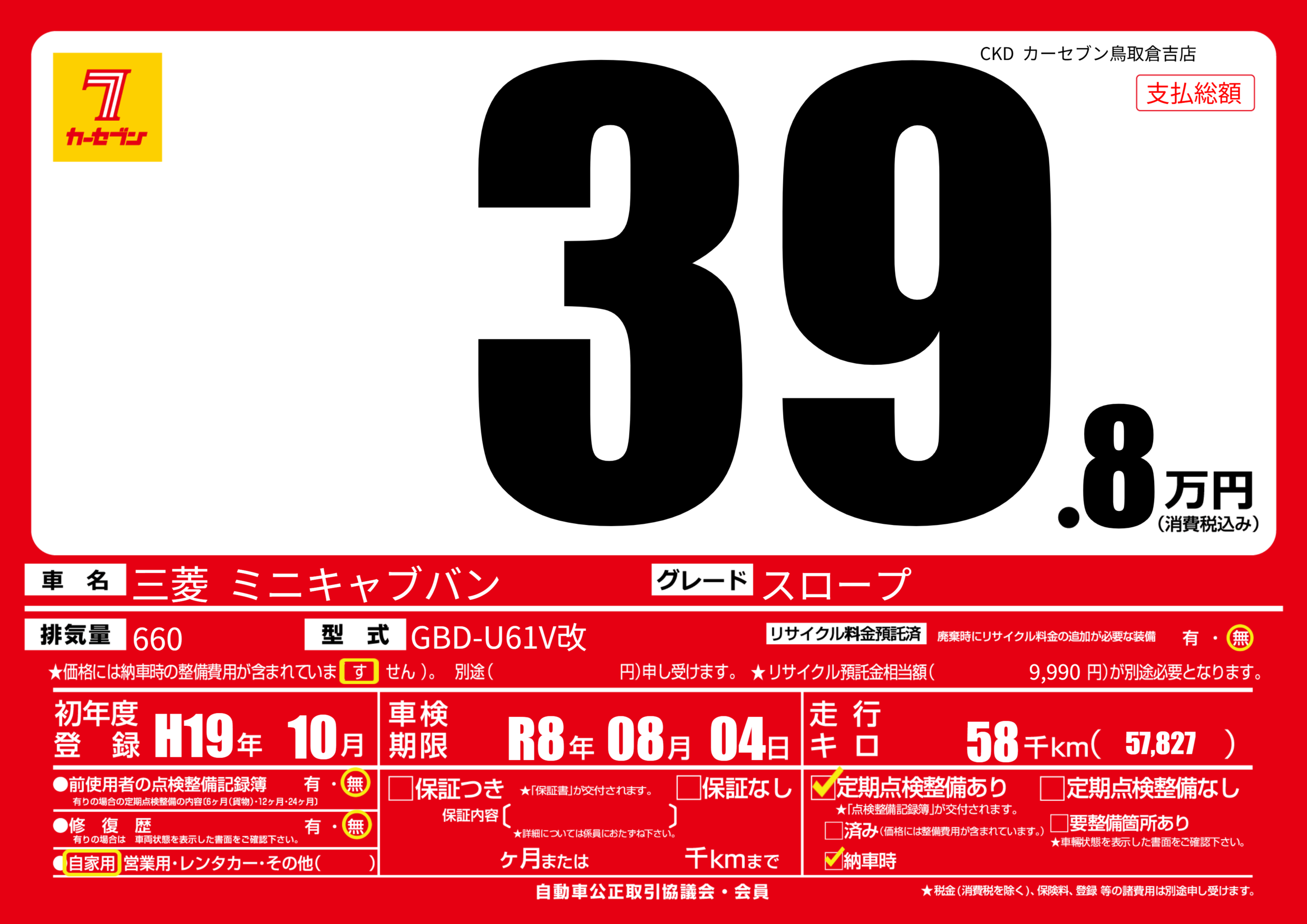 | 車名 | 三菱 ミニキャブバン | グレード ミッション 排気量 |