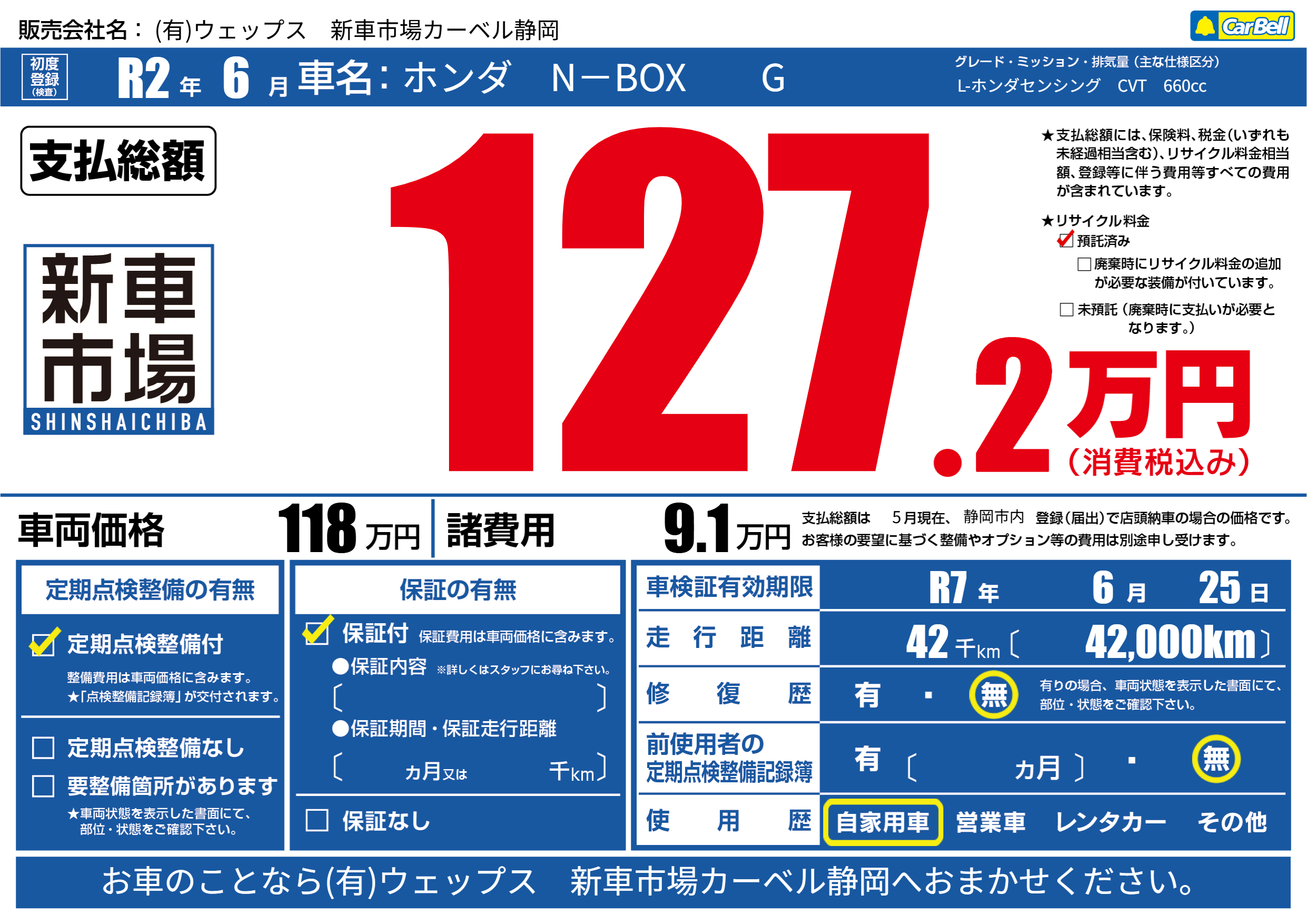 | 車名 | ホンダ N-BOX G | グレード ミッション 排気量 |