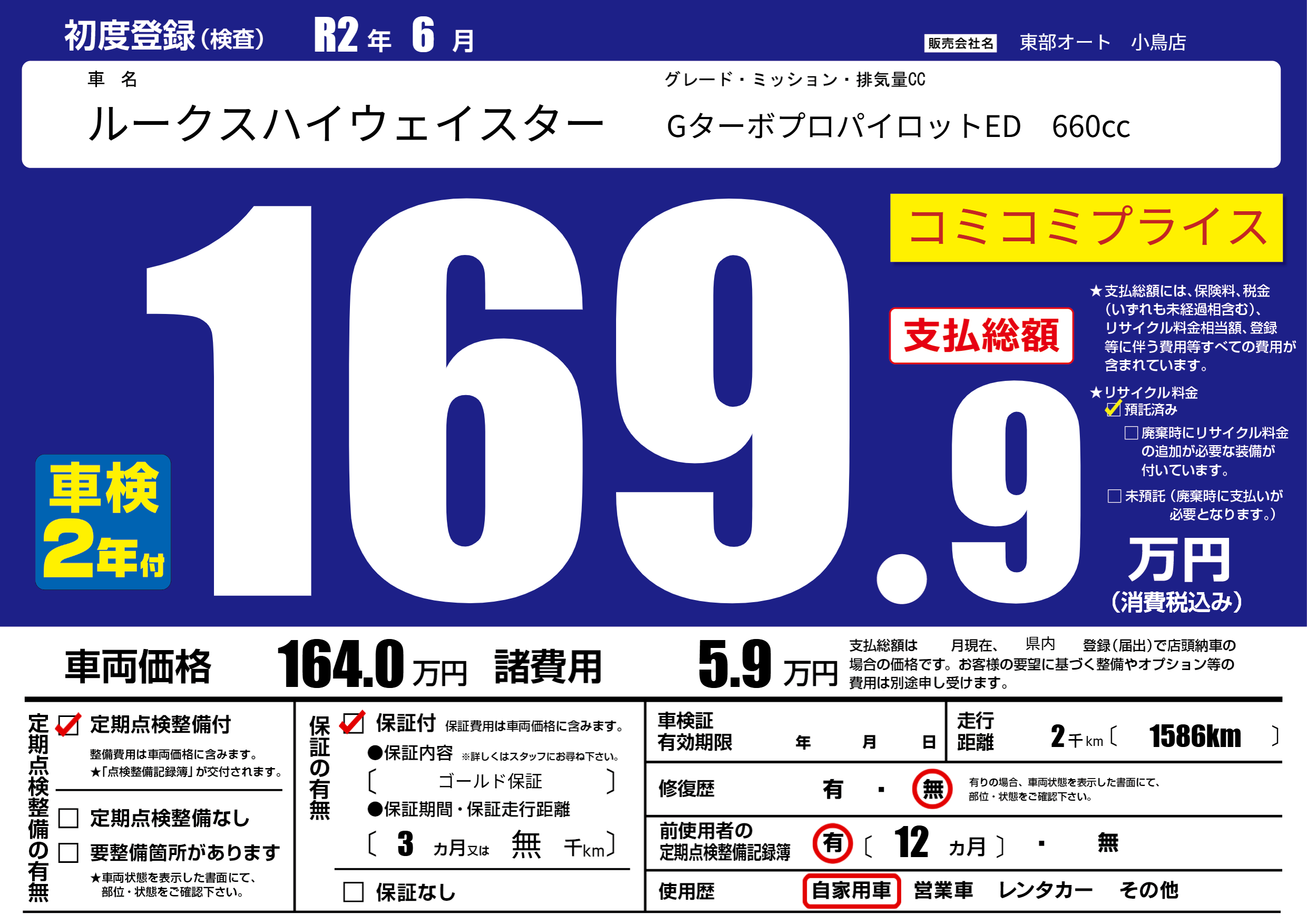 | 走行キロ | 0.2万km | 初年度登録 | R2年6月 |