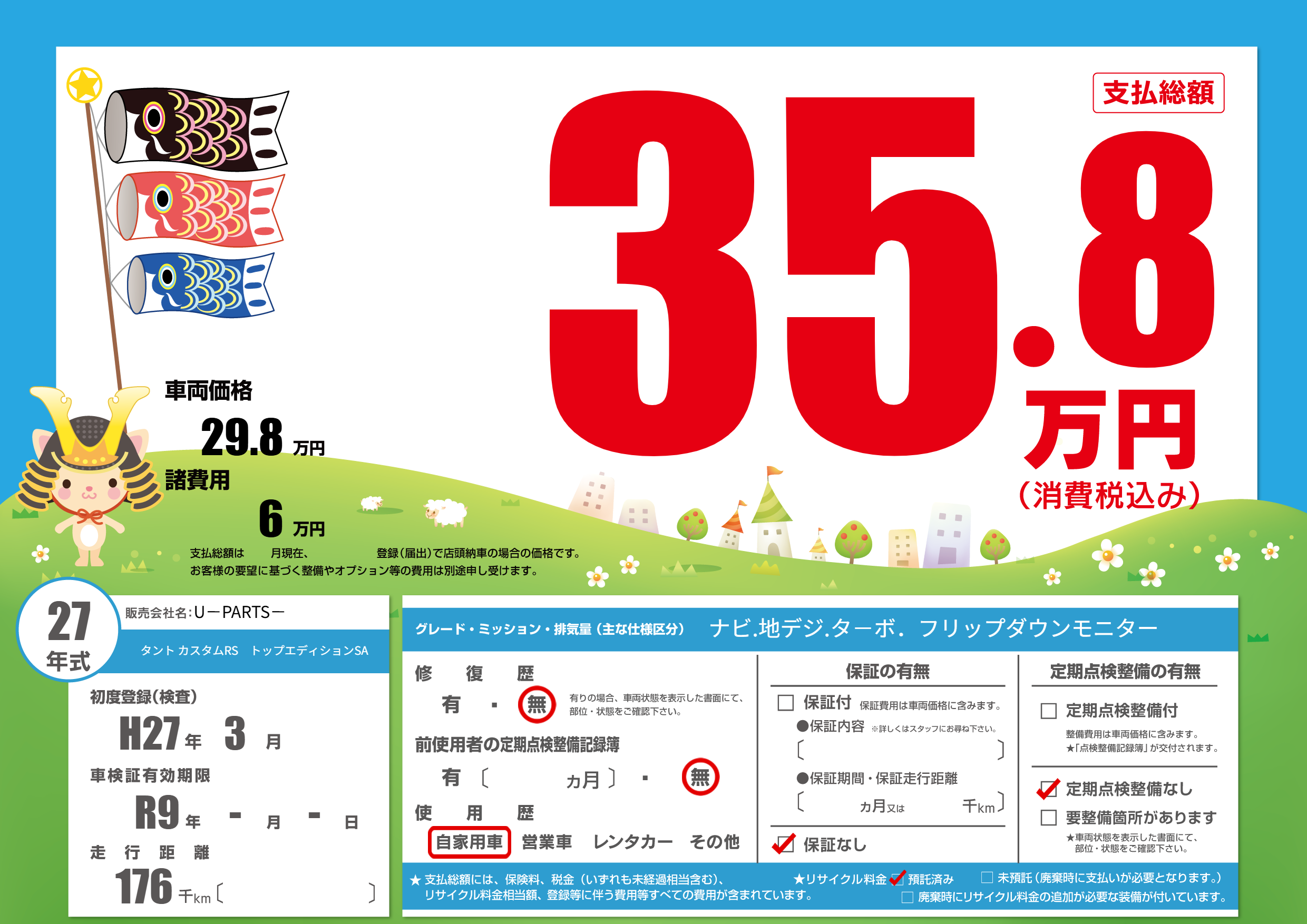 | 走行キロ | 17.6万km | 初年度登録 | H27年3月 |