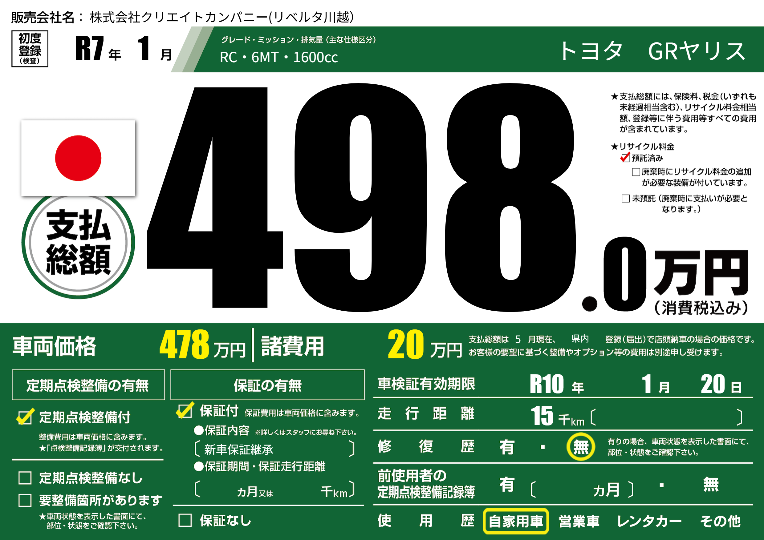 | 車名 | トヨタ GRヤリス | グレード ミッション 排気量 |