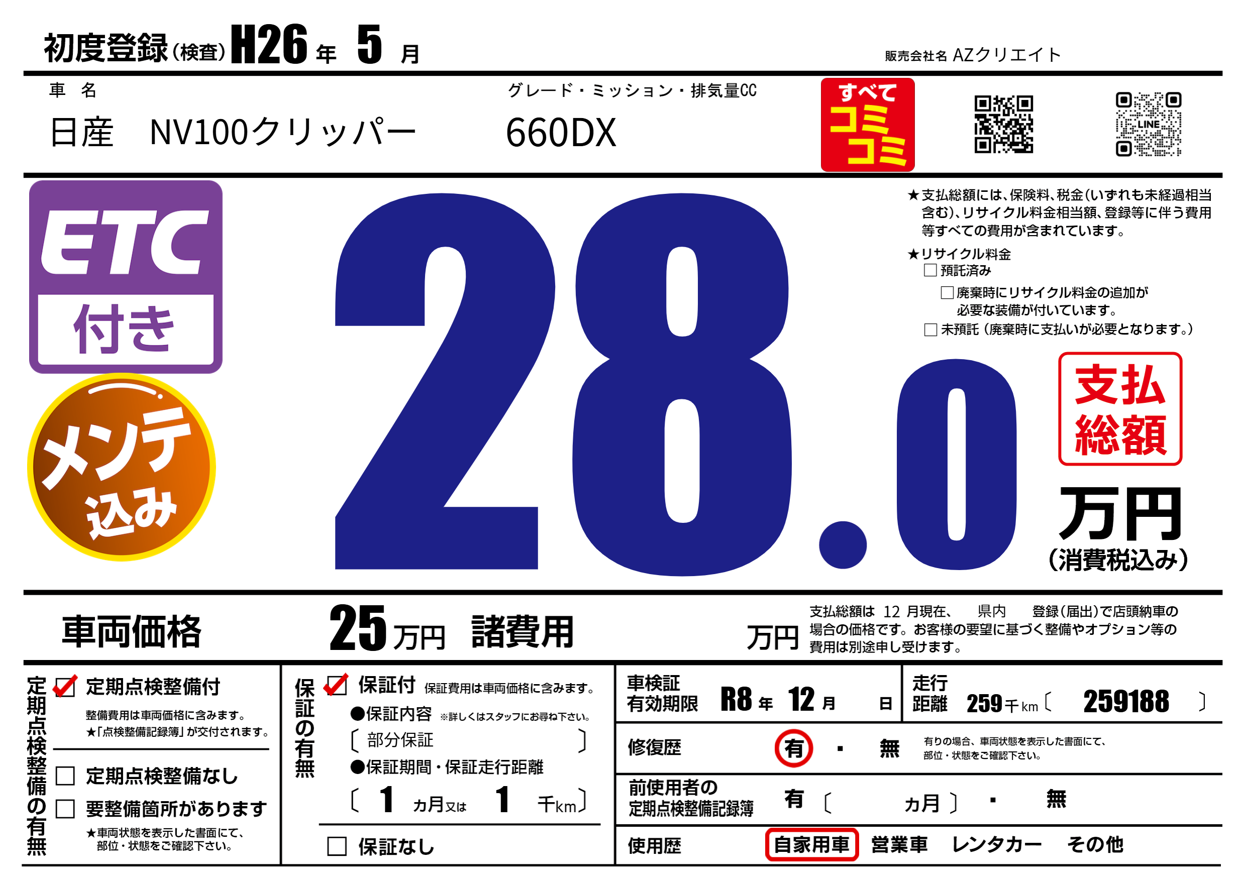 | 走行キロ | 25.9万km | 初年度登録 | H26年5月 |