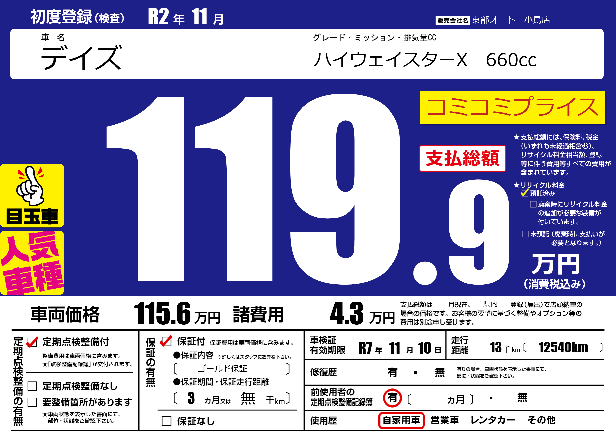| 車検制限 | R7年 11月 10日 | ||