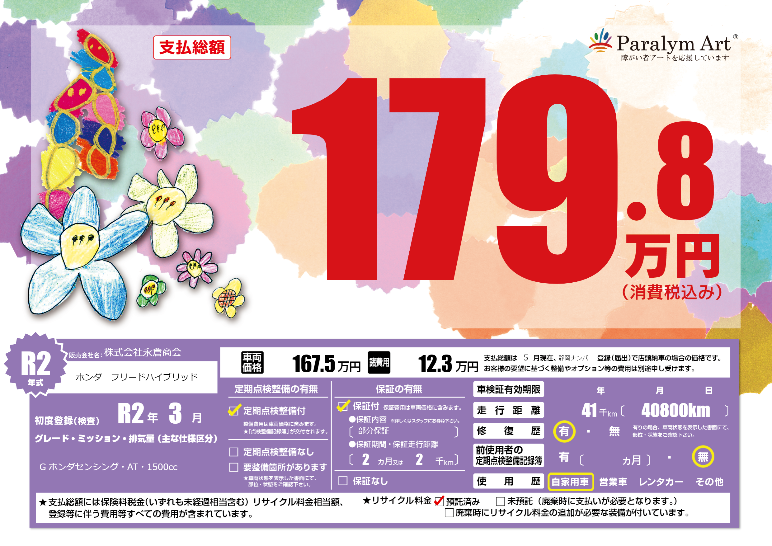| 車名 | ホンダ フリードハイブリッド | グレード ミッション 排気量 |