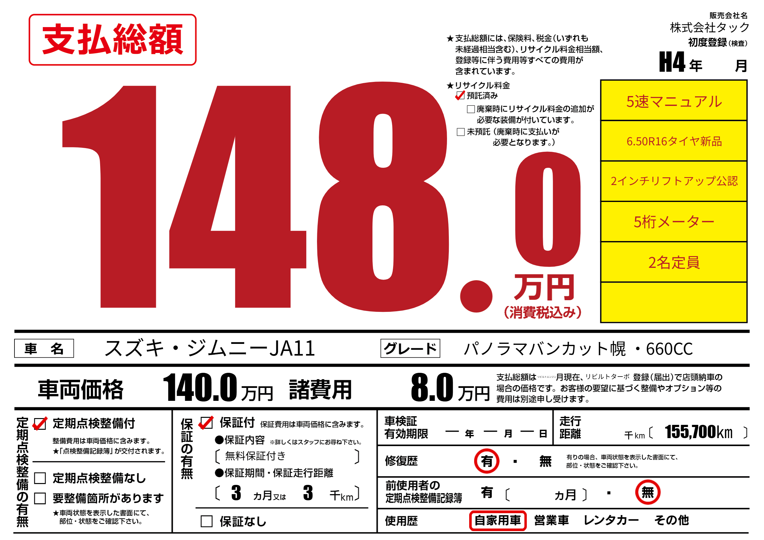 | 車名 | スズキ・ジムニーJA11 | グレード ミッション 排気量 |