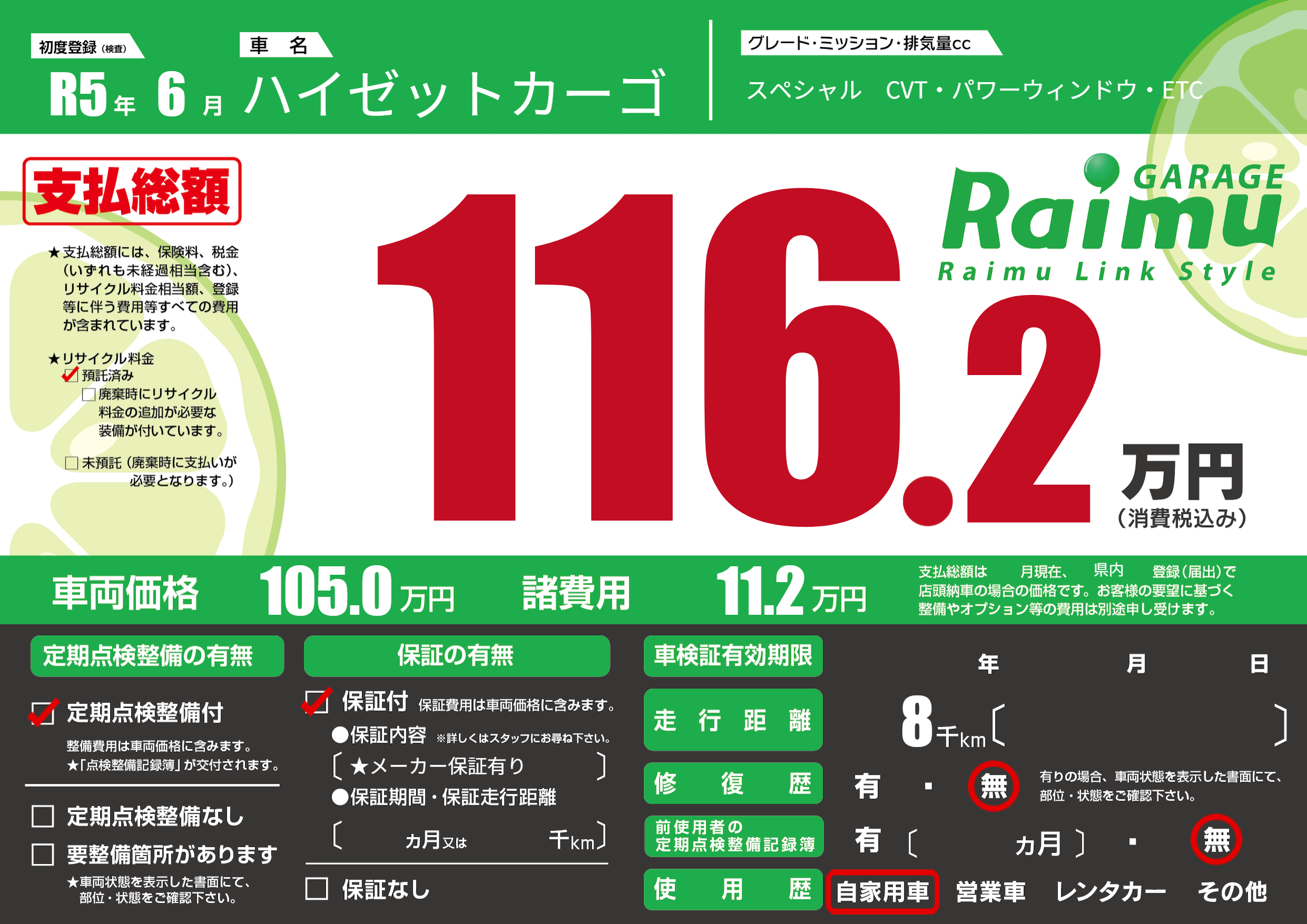 | 走行キロ | 0.8万km | 初年度登録 | R5年6月 |