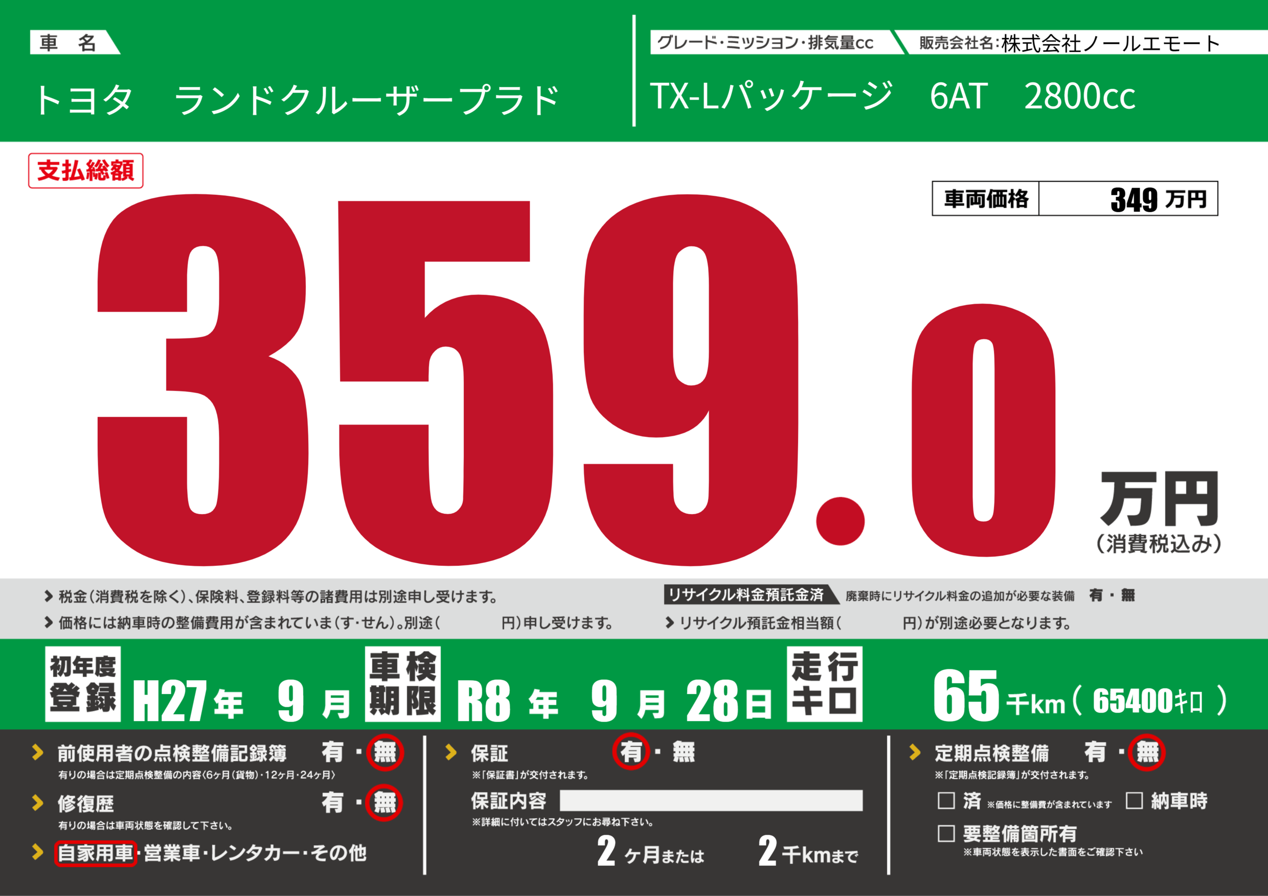 | 車名 | トヨタ ランドクルーザープラド | グレード ミッション 排気量 |