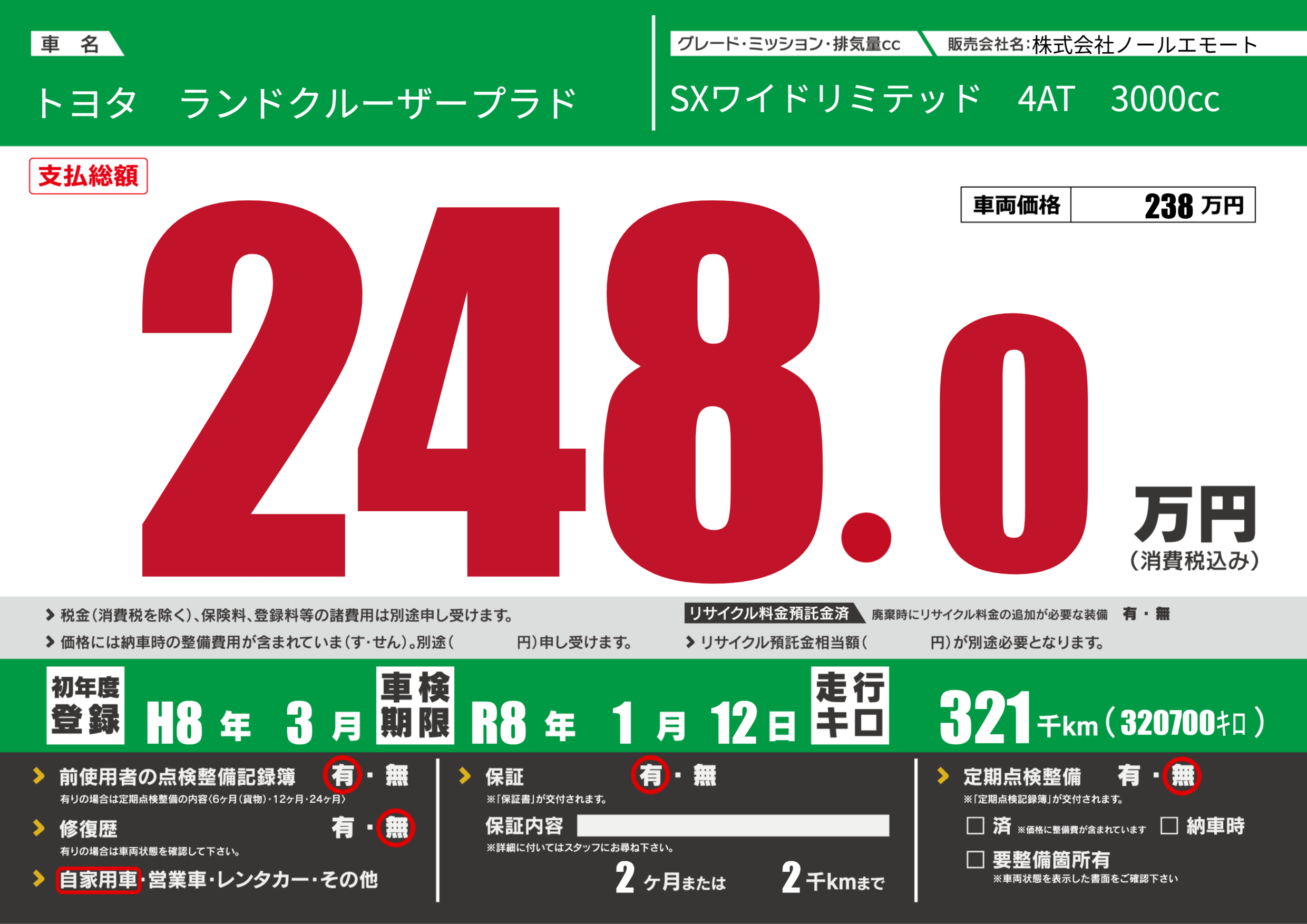 | 車名 | トヨタ ランドクルーザープラド | グレード ミッション 排気量 |