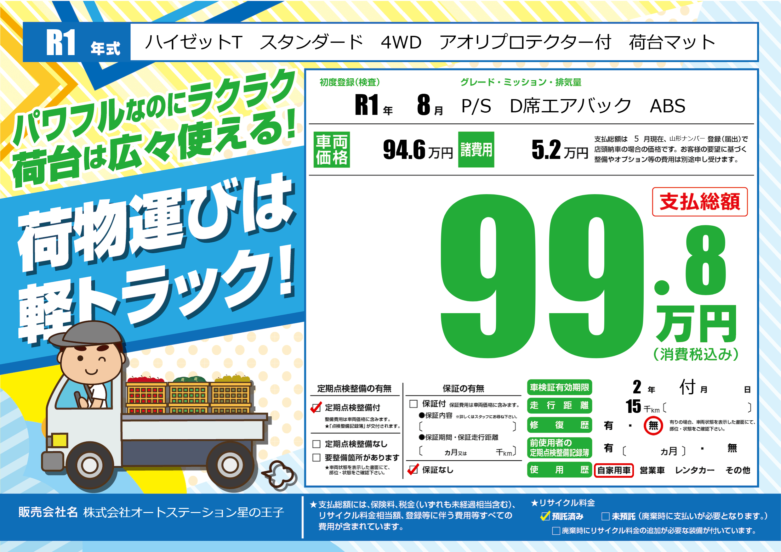 | 車名 | ハイゼットT スタンダード 4WD アオリプロテクター付 荷台マット | グレード ミッション 排気量 |