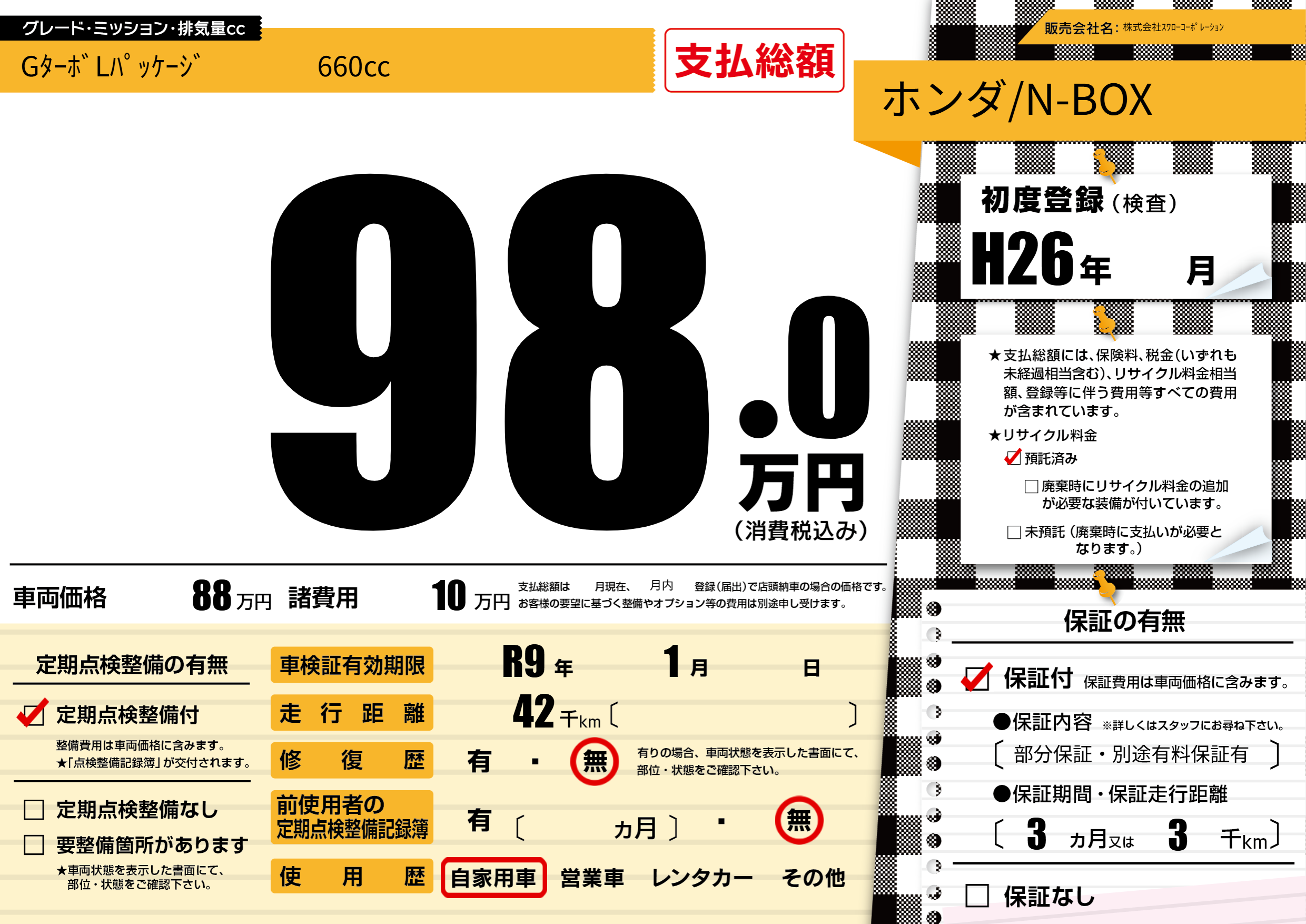 | 車名 | ホンダ/N-BOX | グレード ミッション 排気量 |