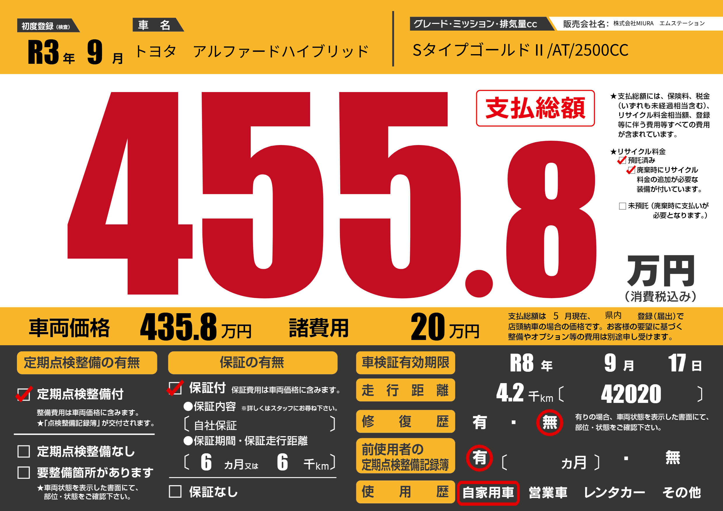 | 走行キロ | 0.4万km | 初年度登録 | R3年9月 |