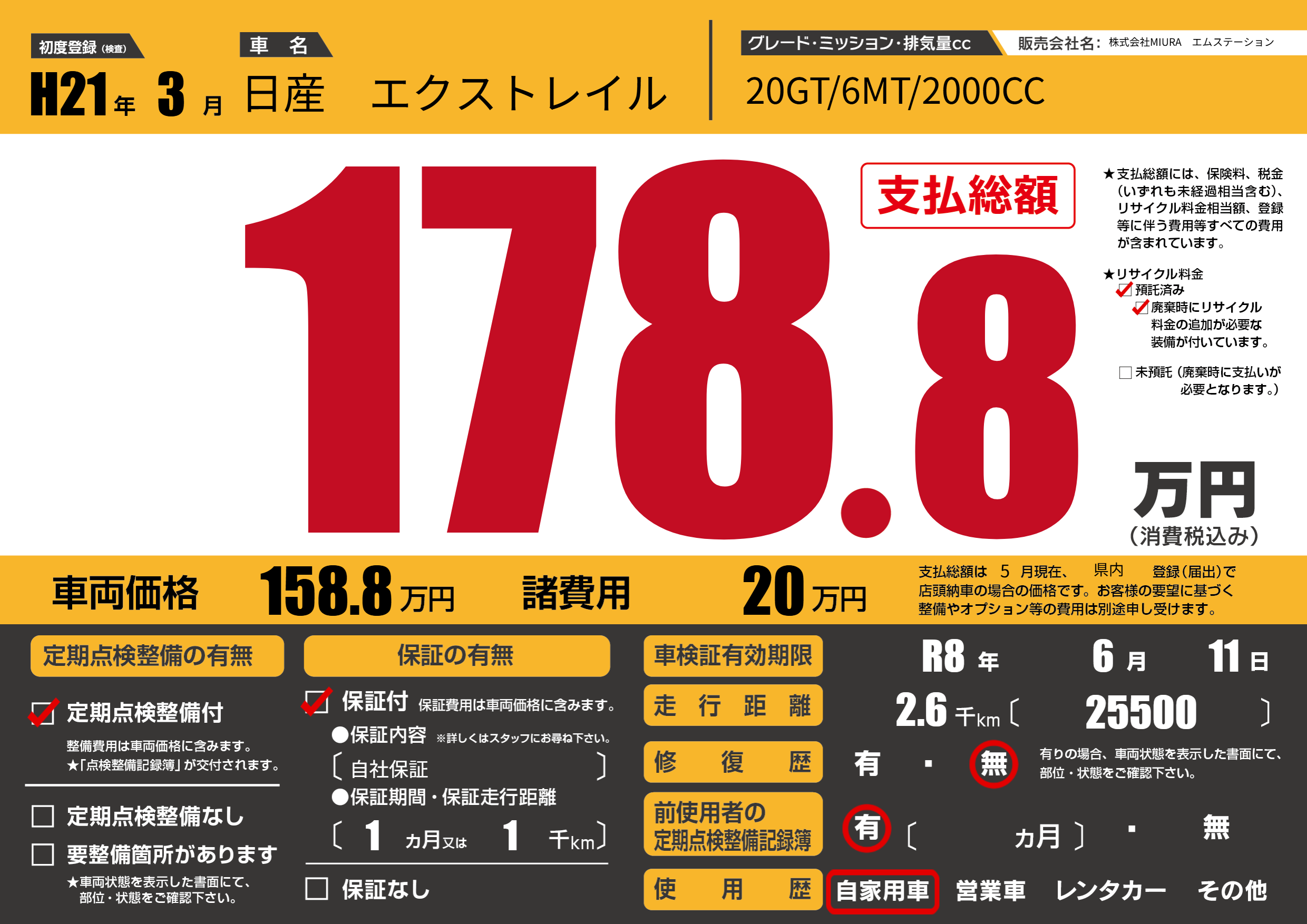 | 走行キロ | 0.2万km | 初年度登録 | H21年3月 |