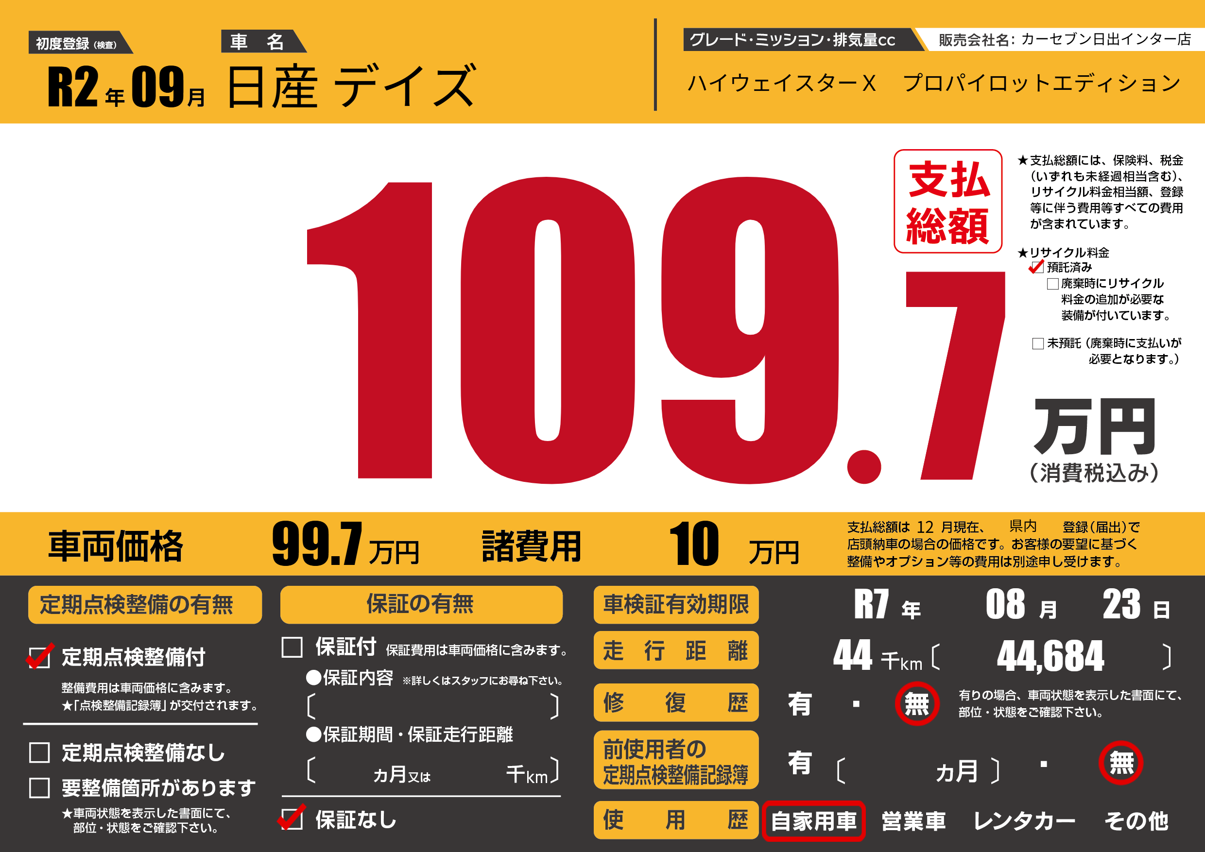 | 車名 | 日産 デイズ | グレード ミッション 排気量 |
