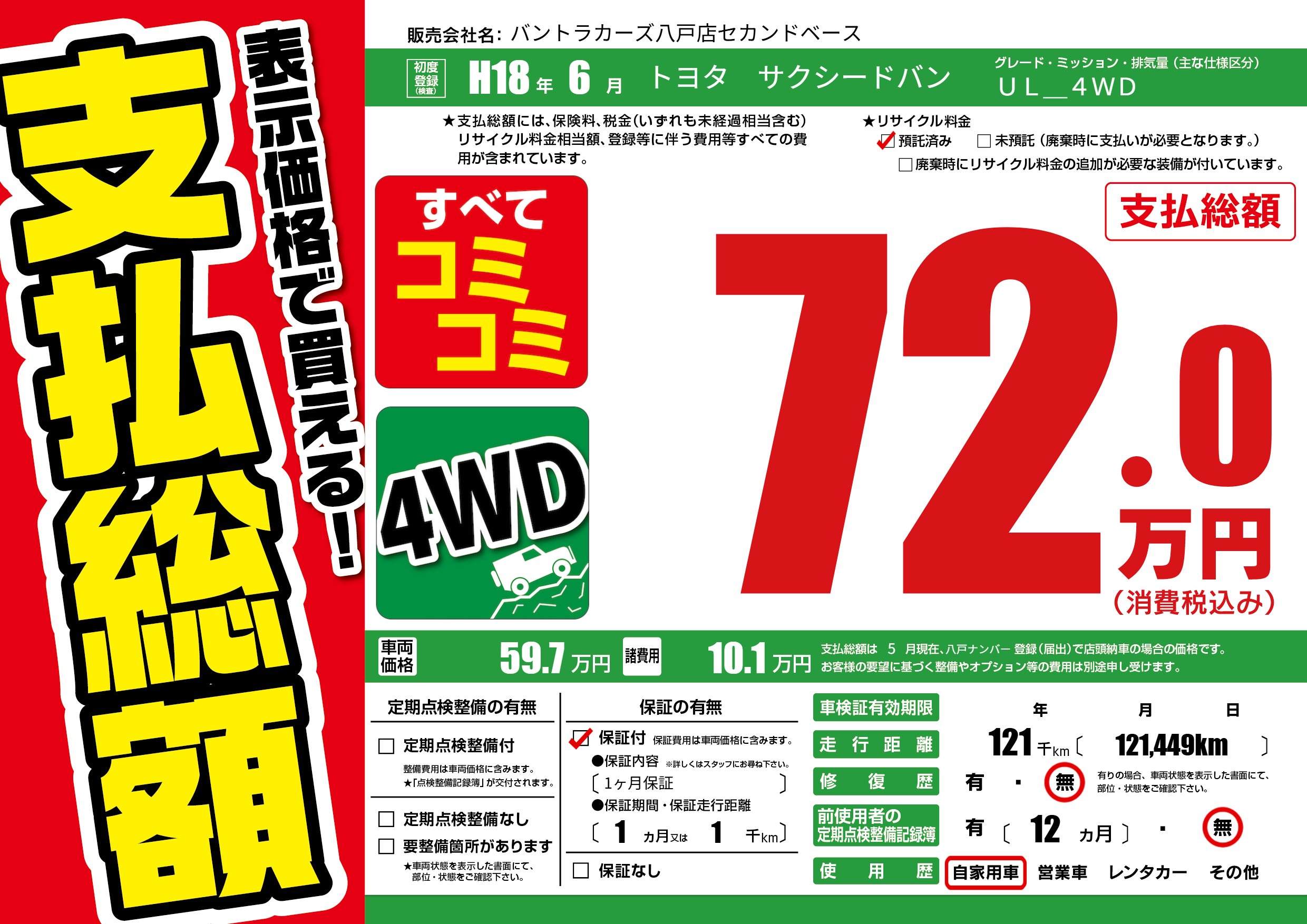 | 走行キロ | 12.1万km | 初年度登録 | H18年6月 |