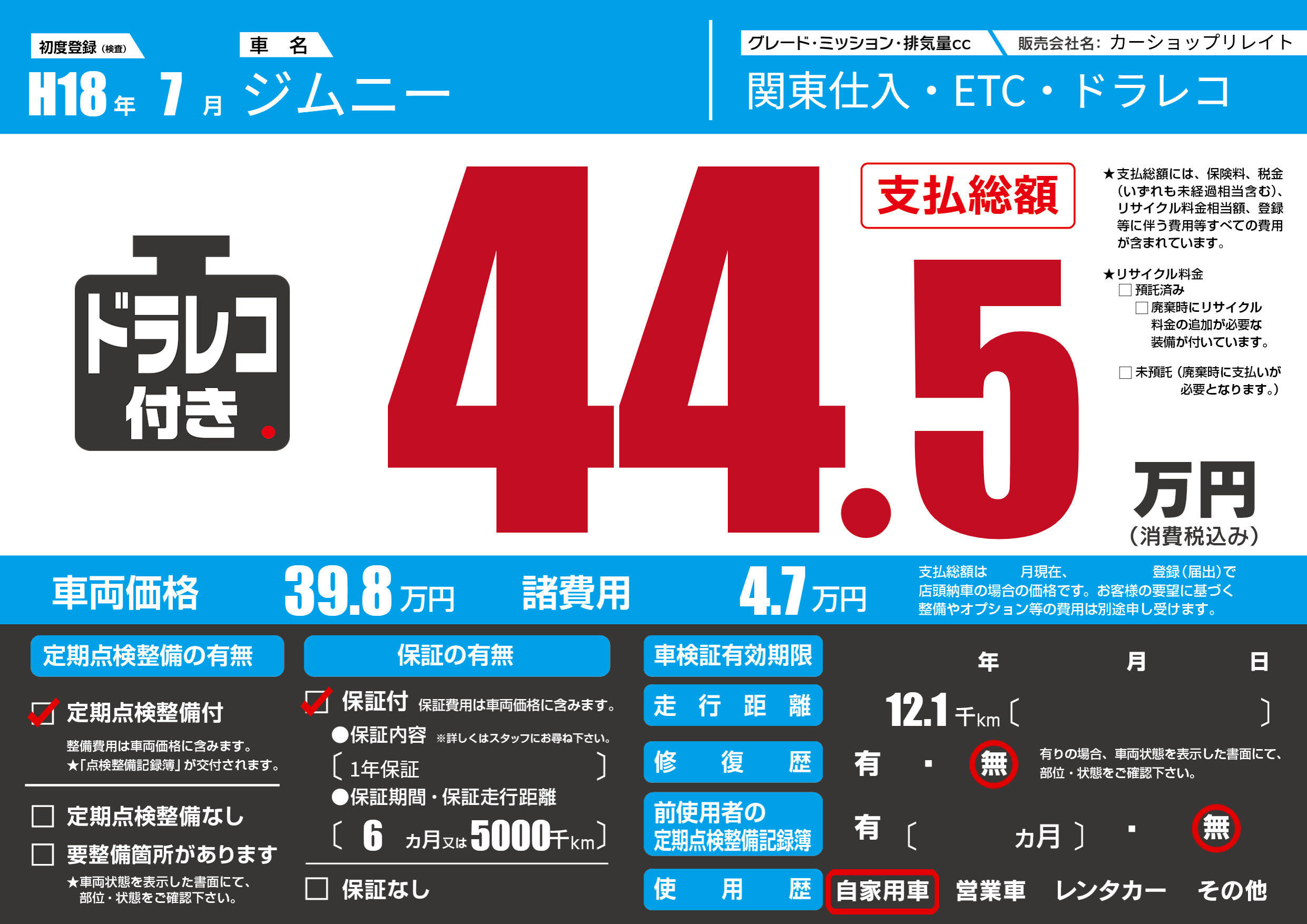 保証付き 保証内容(1年保証) 6ヶ月または(5000)千kmまで |