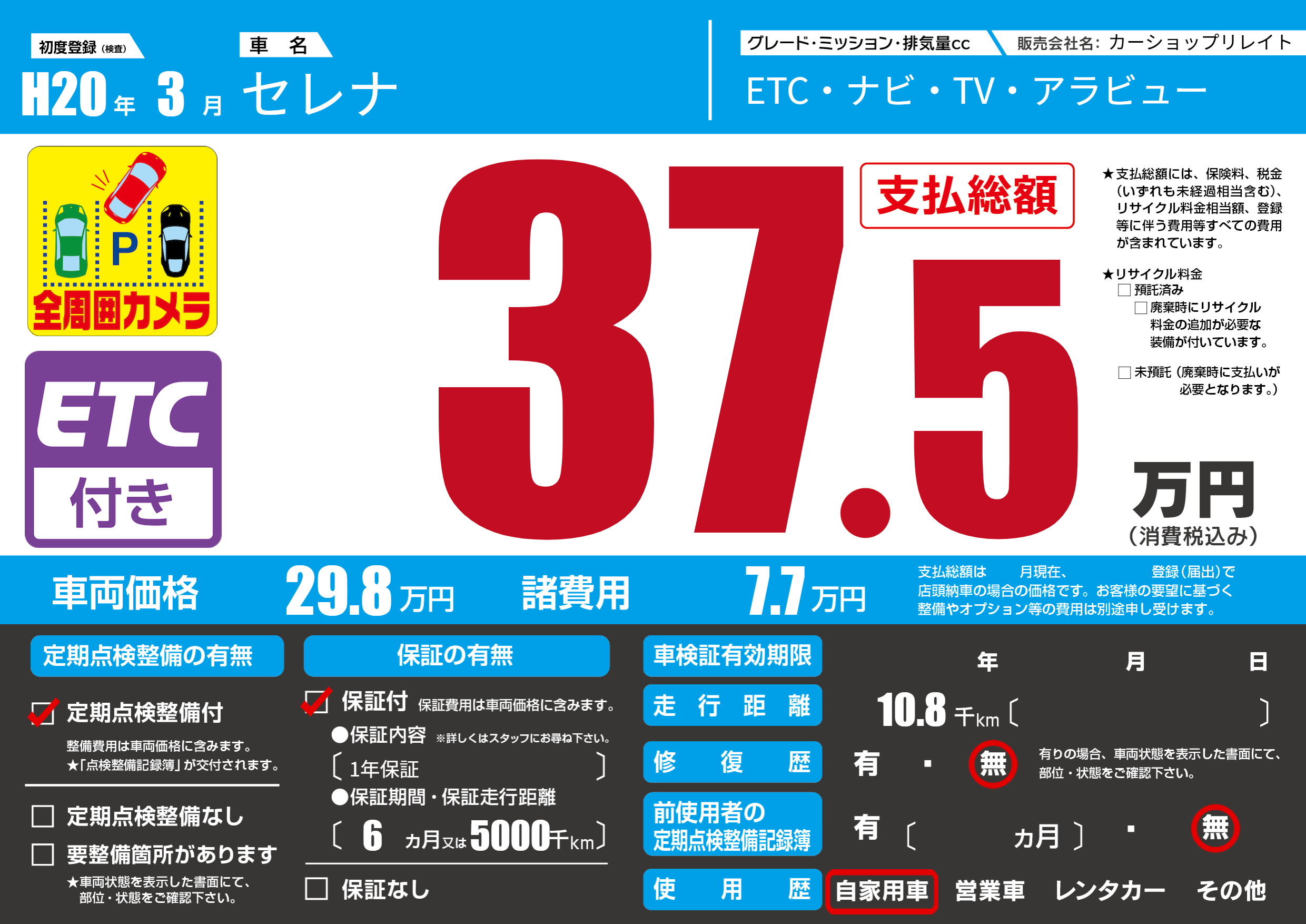 | 走行キロ | 1万km | 初年度登録 | H20年3月 |