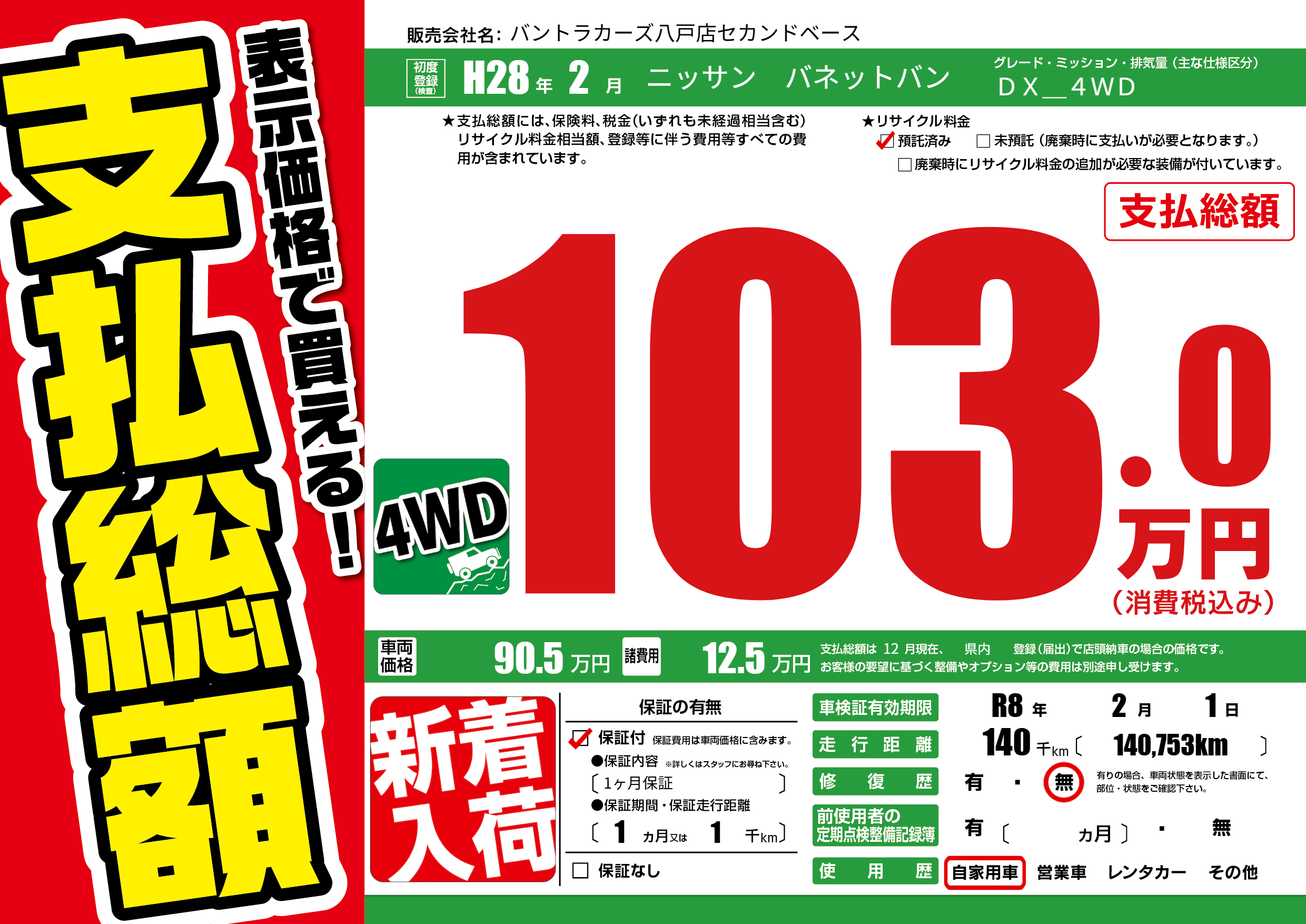 | 車名 | ニッサン バネットバン | グレード ミッション 排気量 |