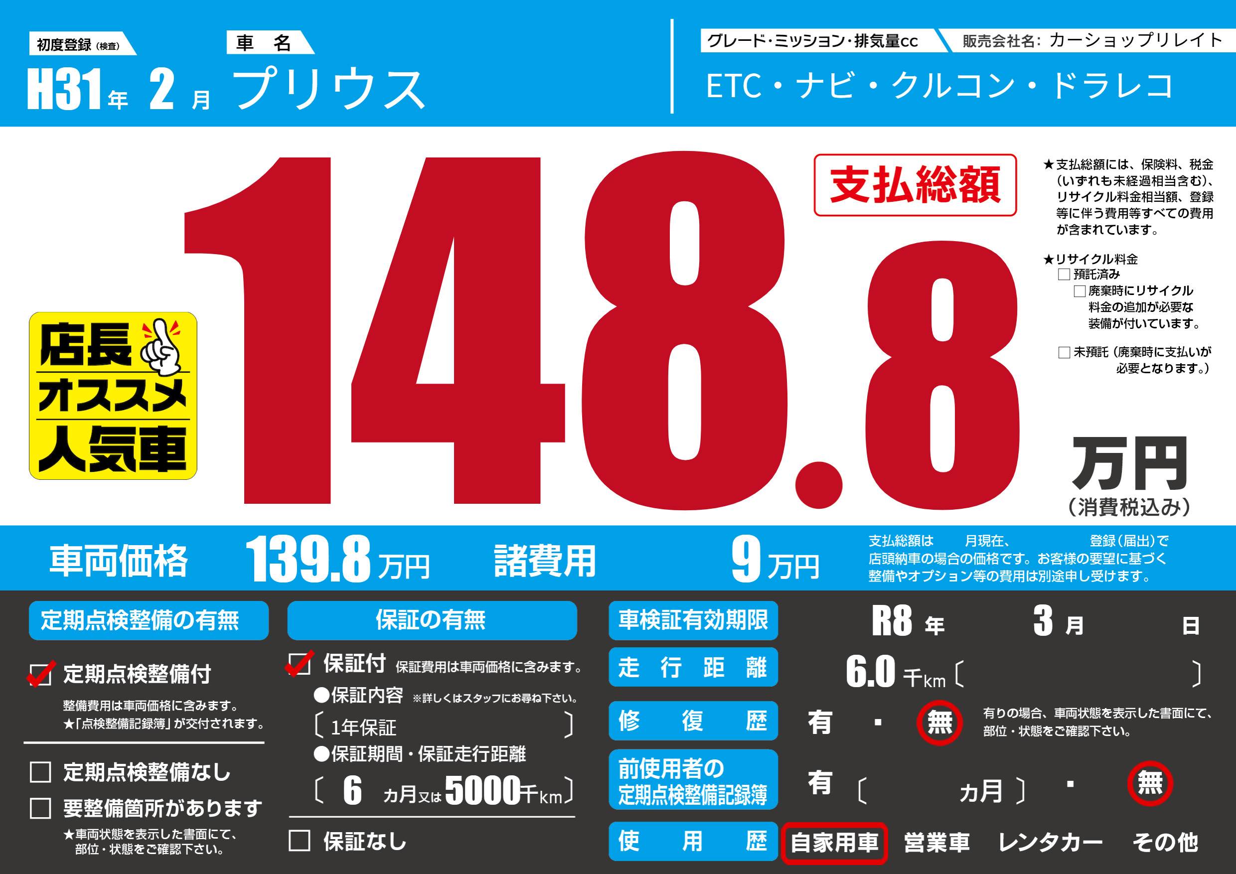 | 車名 | プリウス | グレード ミッション 排気量 |