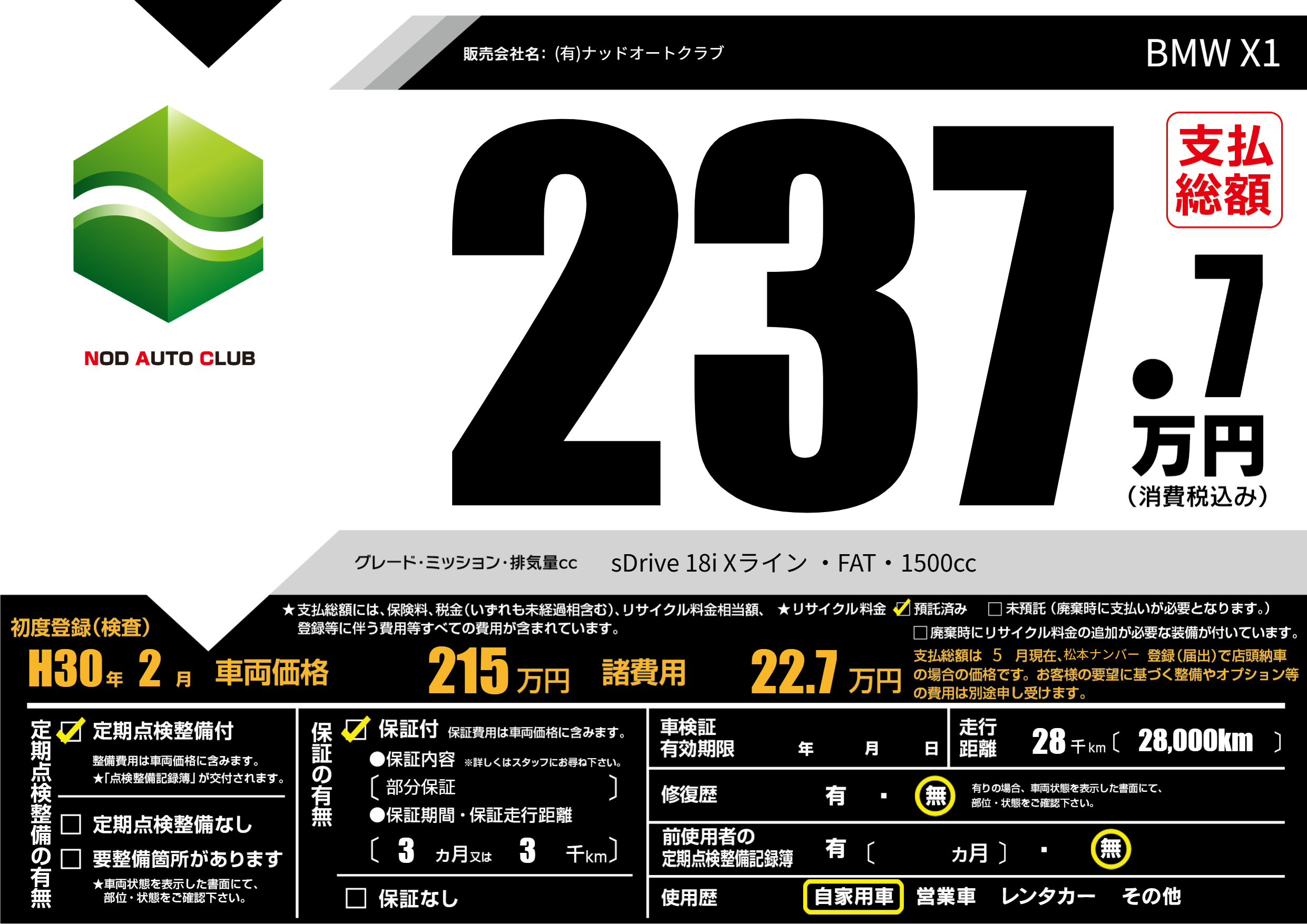 | 車名 | BMW X1 | グレード ミッション 排気量 |