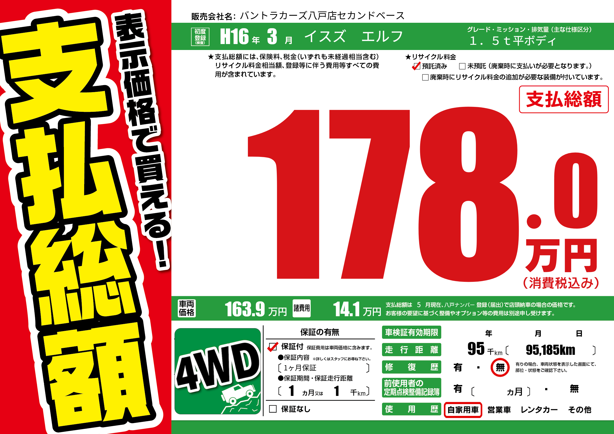 | 走行キロ | 9.5万km | 初年度登録 | H16年3月 |