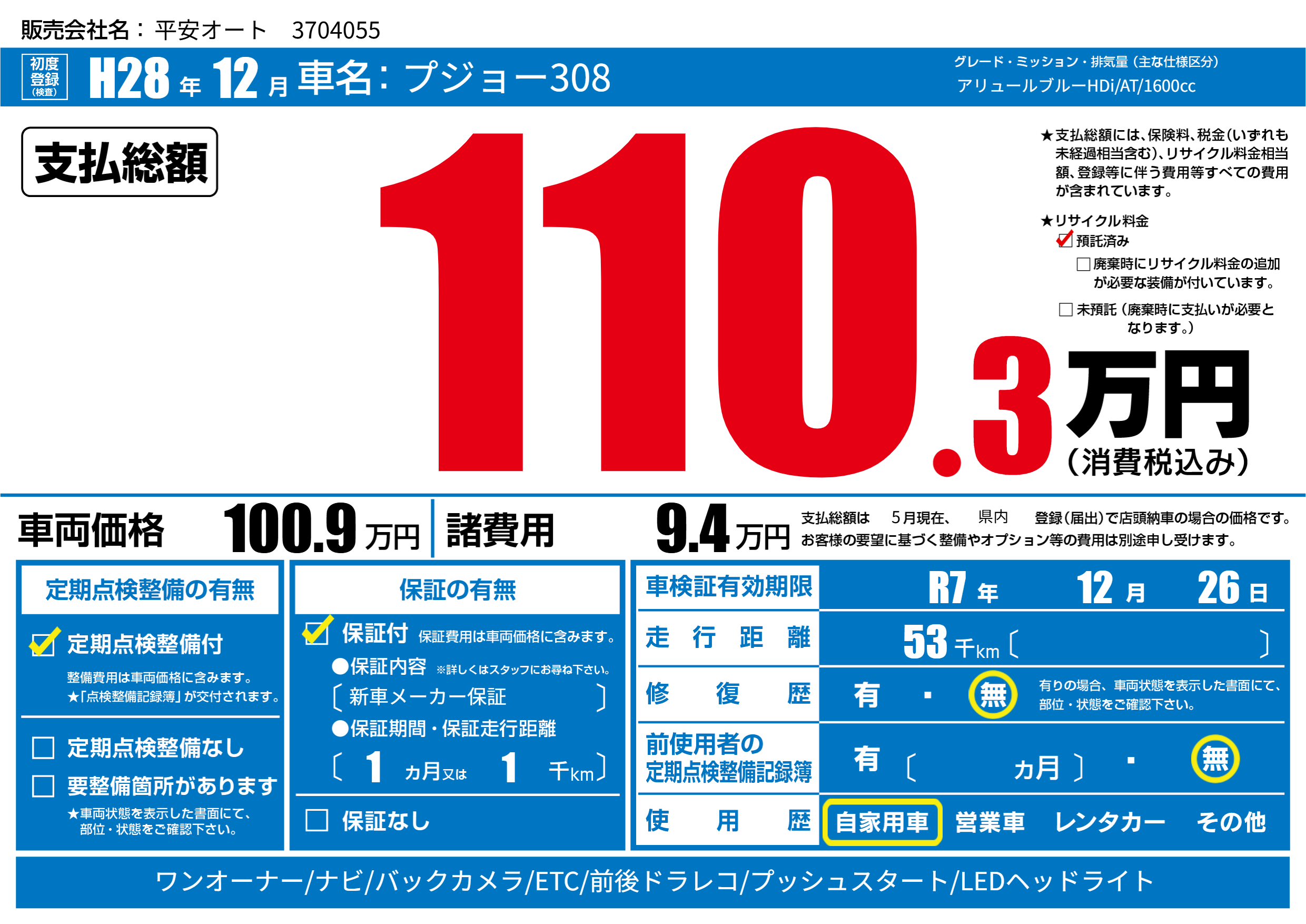 | 車名 | プジョー308 | グレード ミッション 排気量 |