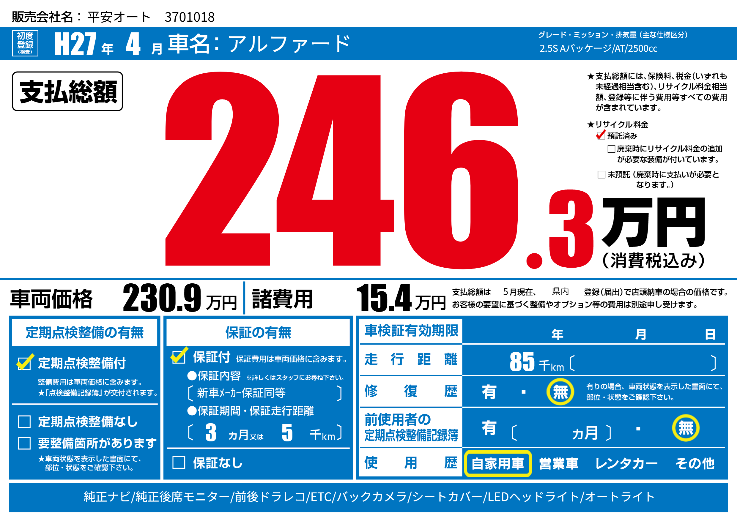 | 走行キロ | 8.5万km | 初年度登録 | H27年4月 |
