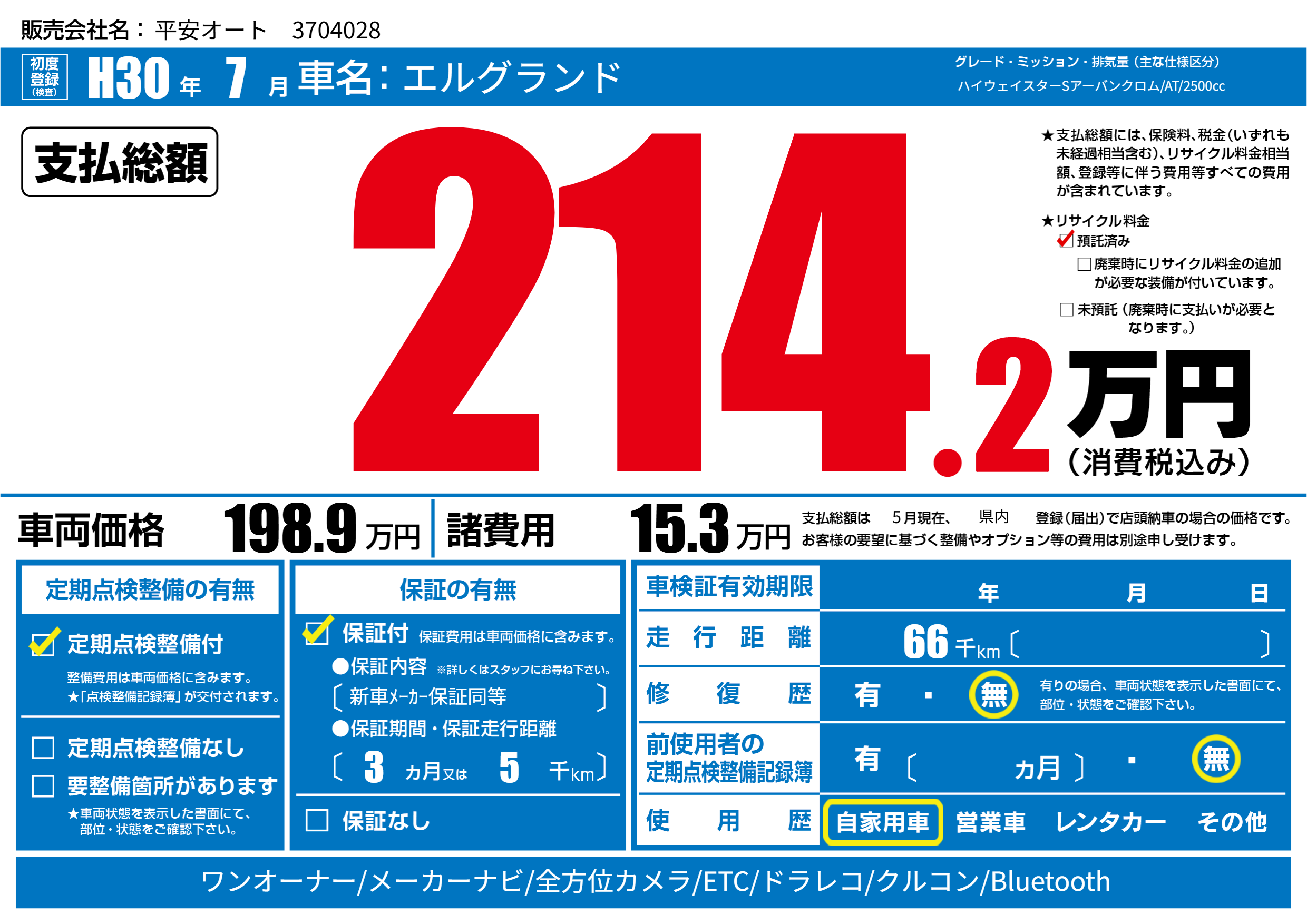 | 走行キロ | 6.6万km | 初年度登録 | H30年7月 |