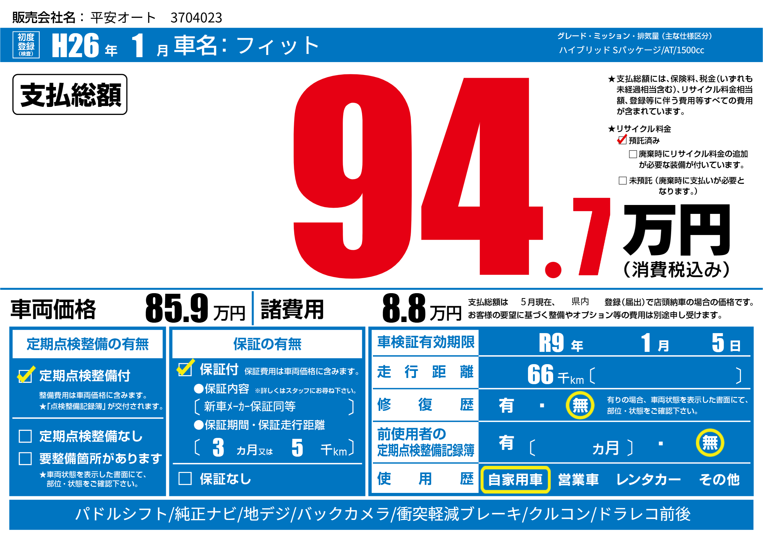 | 走行キロ | 6.6万km | 初年度登録 | H26年1月 |