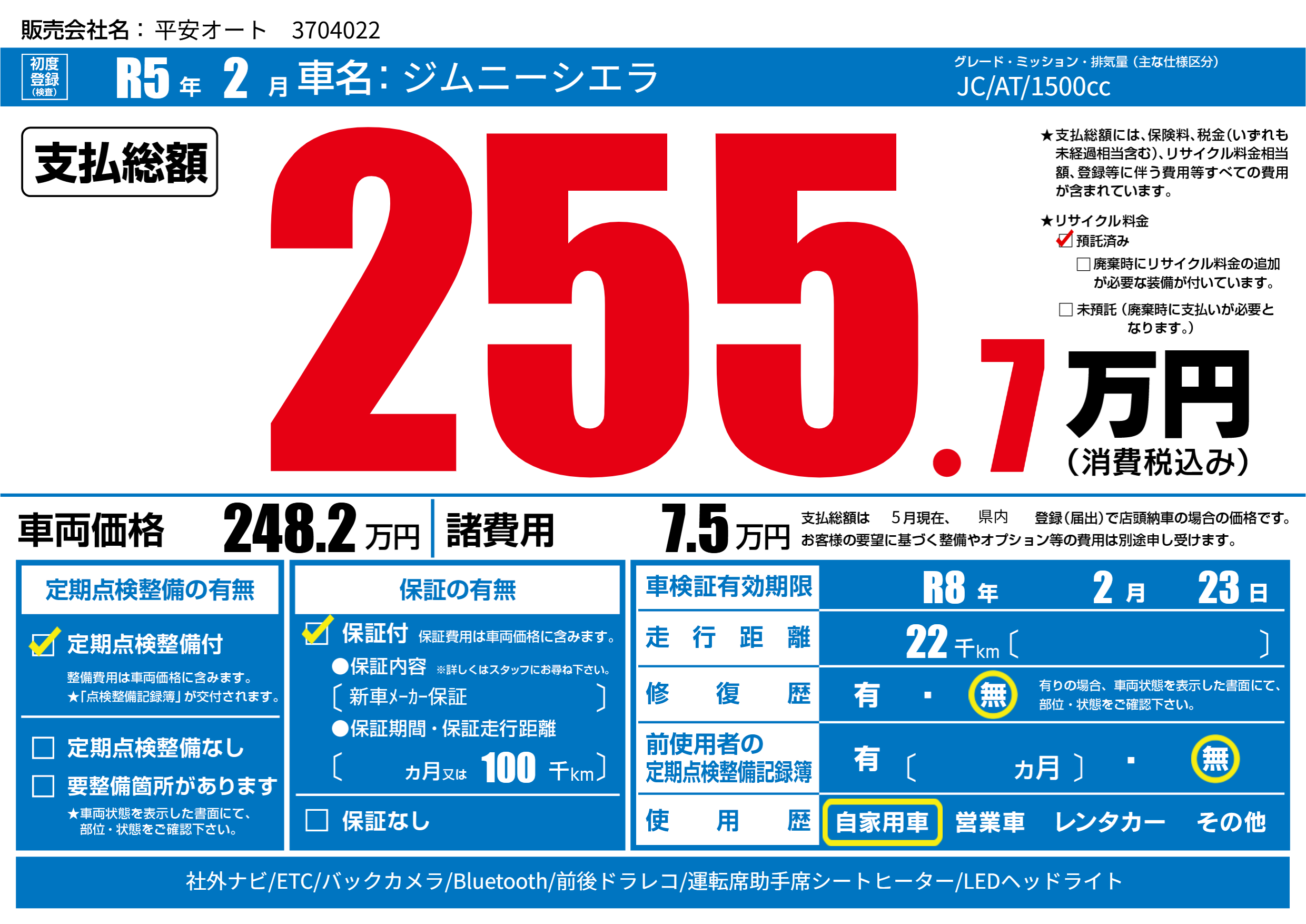 | 車名 | ジムニーシエラ | グレード ミッション 排気量 |