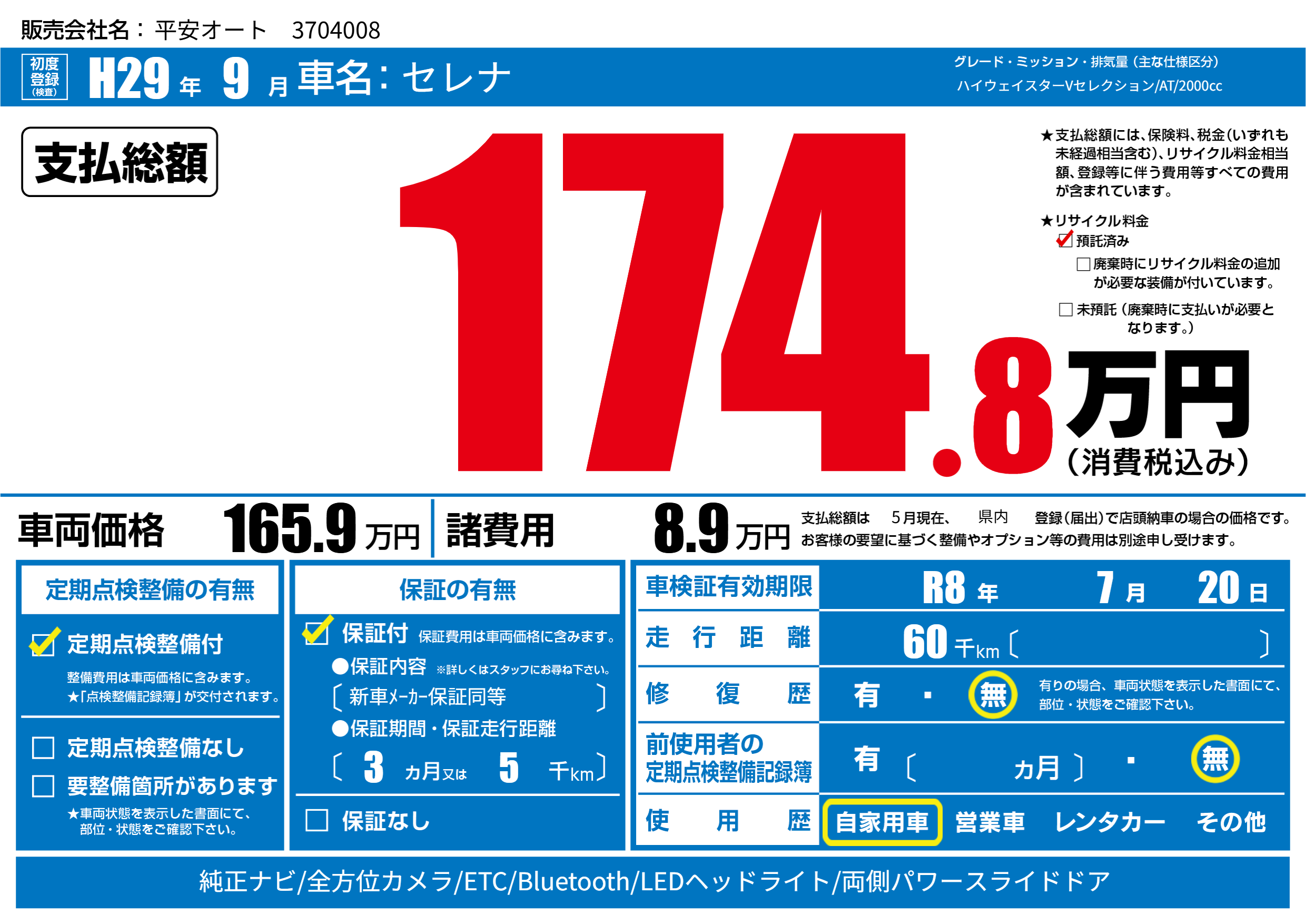 | 走行キロ | 6万km | 初年度登録 | H29年9月 |