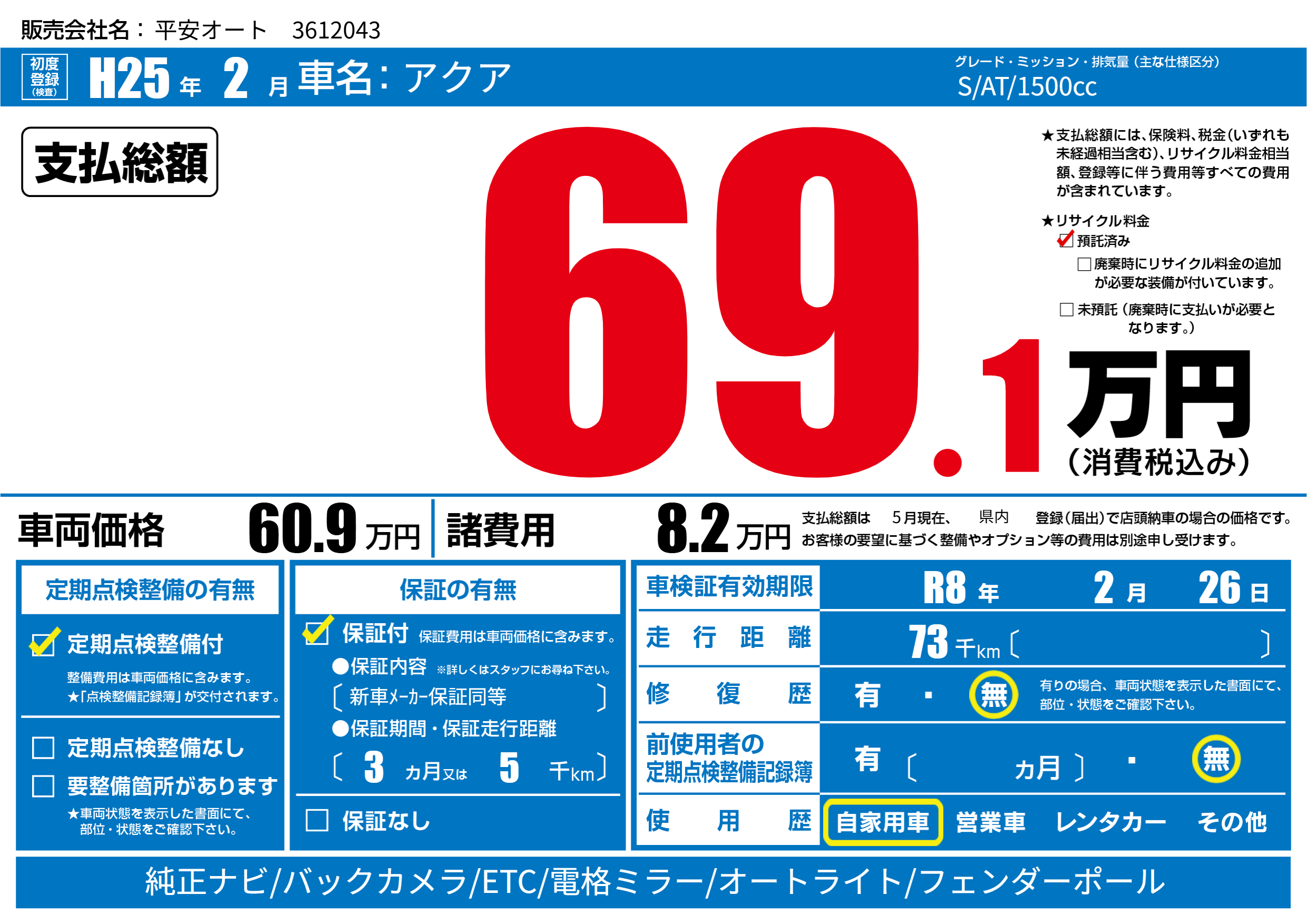 なし | 車検制限 | R8年2月26月 |