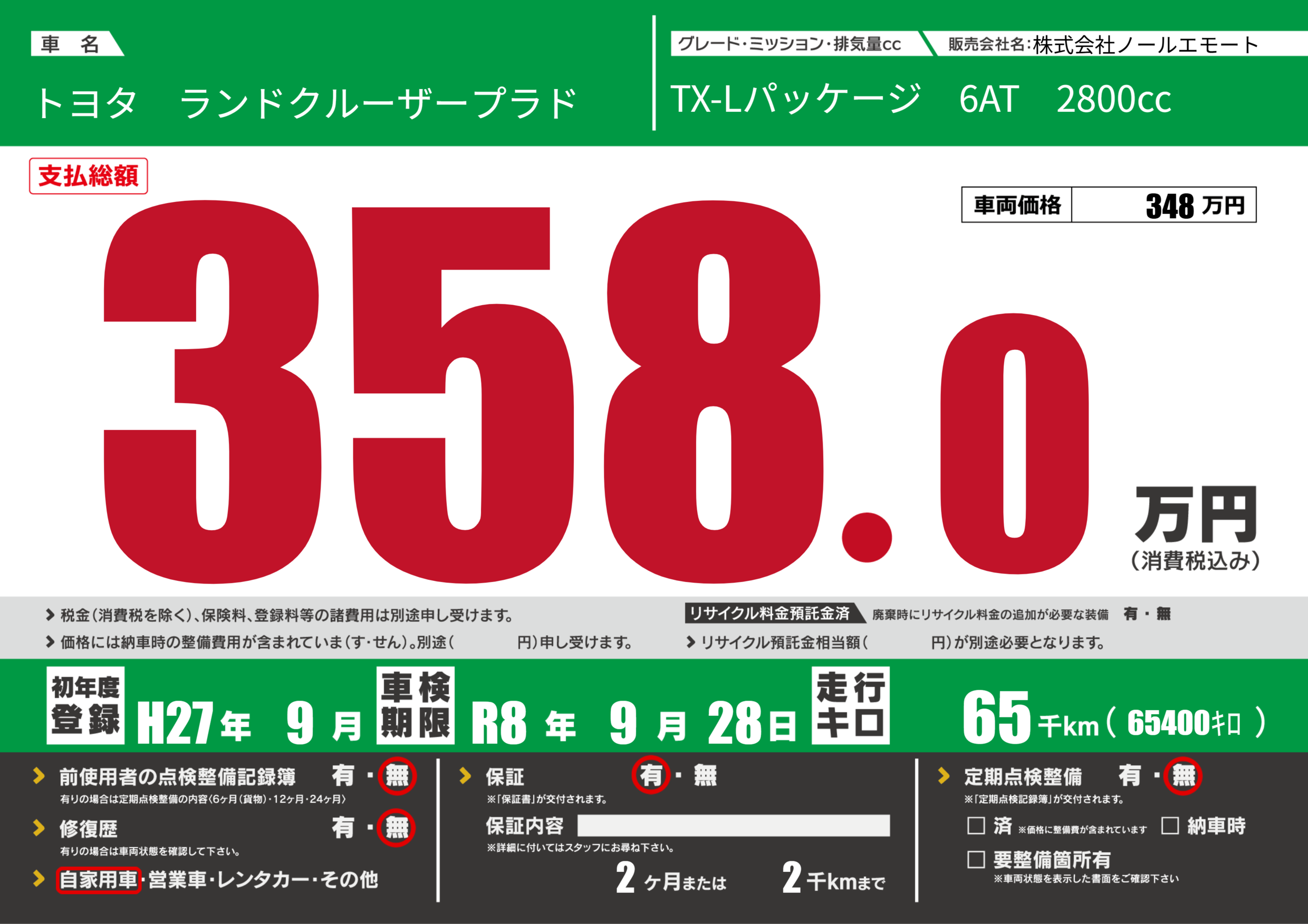 | 車名 | トヨタ ランドクルーザープラド | グレード ミッション 排気量 |