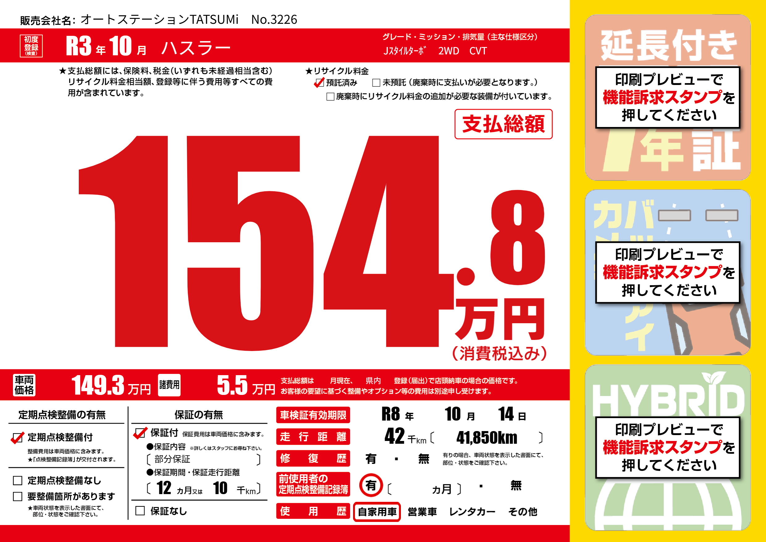 保証付き 保証内容(部分保証) 12ヶ月または(10)千kmまで |
